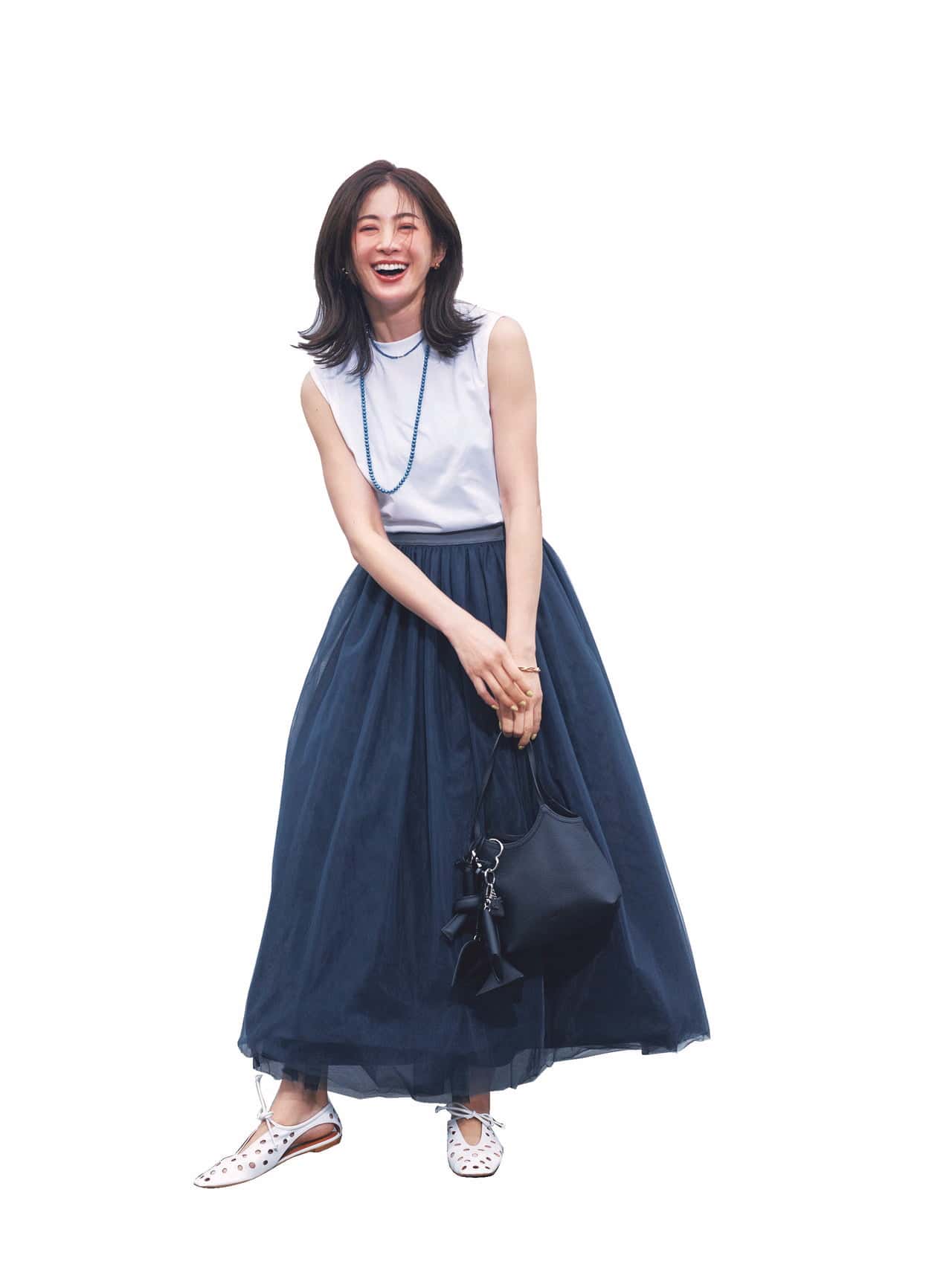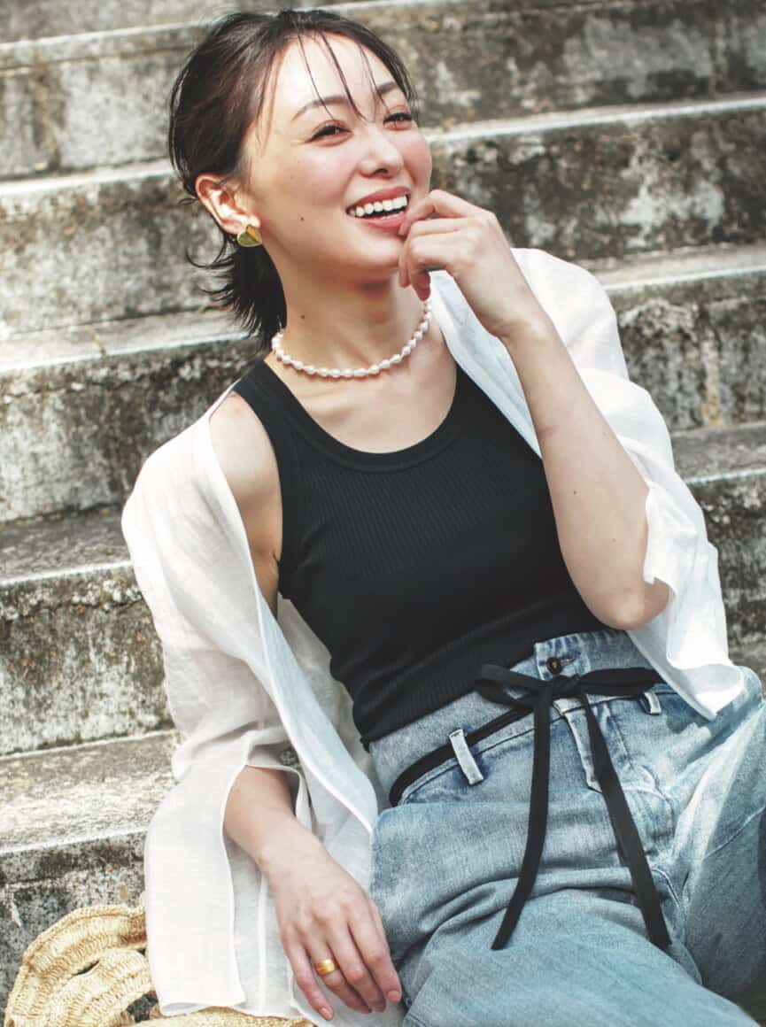 デコルテが見えるタンクトップは、バロックパールのネックレスを合わせて、女性らしくきちんと感をプラス。一つ一つサイズの異なるバロックパールのナチュラルなデザインが気張っていなくて夏にgood。ピアスやリングは、ゴールドで辛口めに調整。