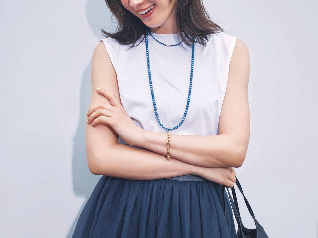 シンプルな白Tを彩る2連のブルーパールネックレス。長めのパールネックレスは、それだけで存在感が漂い、手抜き感が払拭されます。ネイビーのスカートとは、統一感があり、抜群の相性。チェーンのブレスレットは、肌馴染みの良いゴールドで程良いアクセントに。