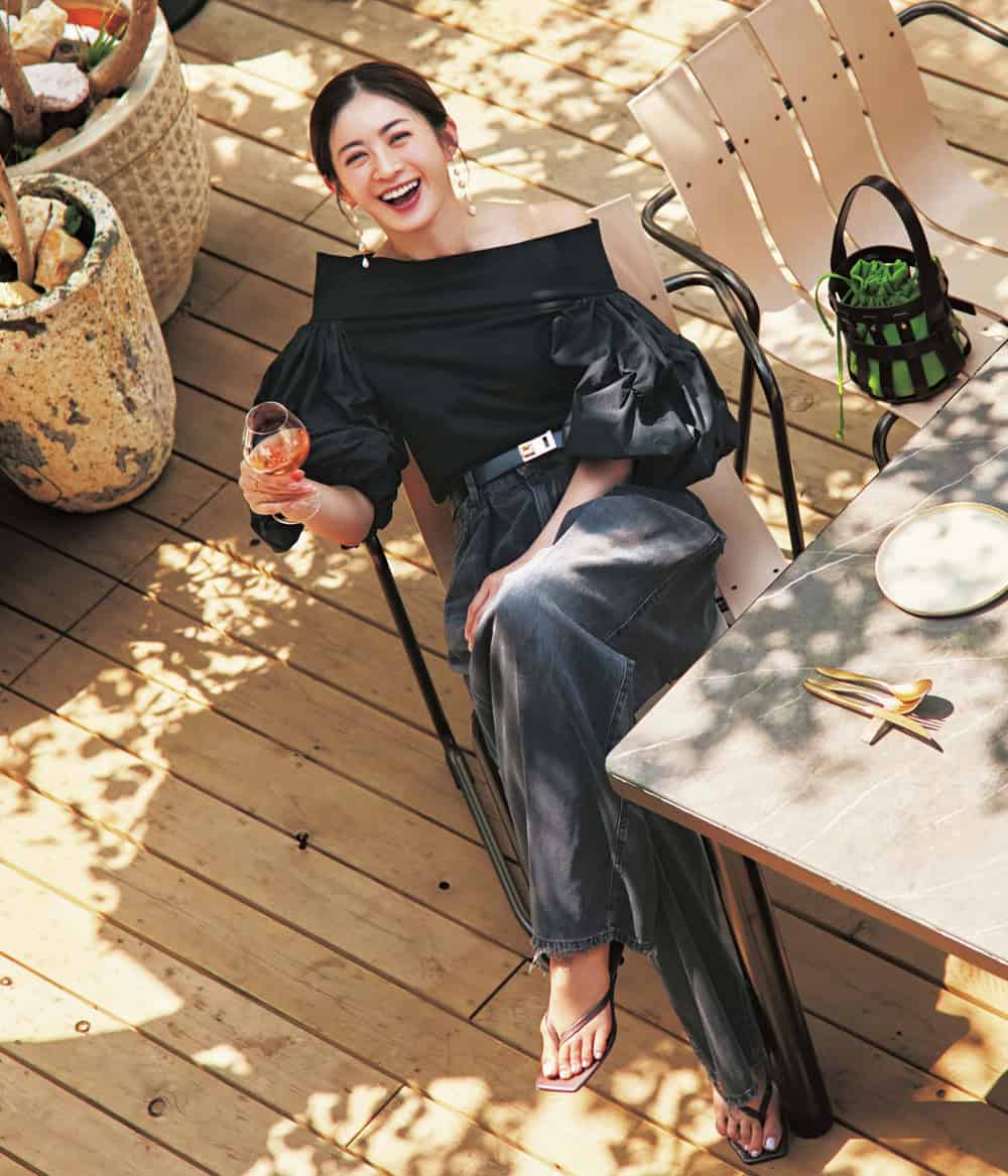 大人の肌見せは品よく、かっこよくが肝。女性らしさが際立つデコルテを強調するオフショルはボトムスでカジュアルダウンするとヘルシーに。ブラックデニムでセットアップ風に着こなすと気張りすぎず大人シックにまとまります。ちょっぴり攻めたオシャレで日常から解放!