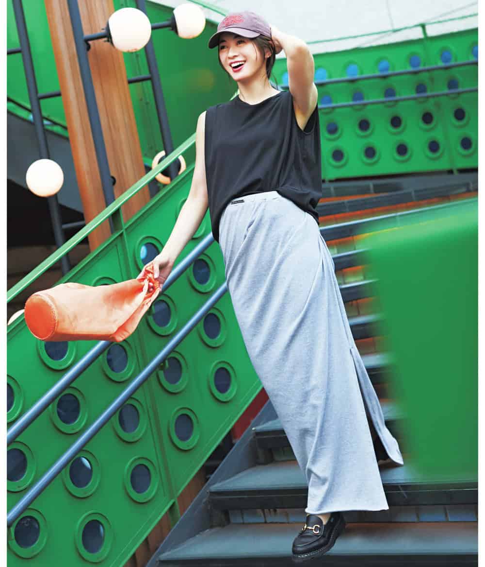 ノースリトップス¥3,990(アンフィーロ/オンワード樫山 お客様相談室)スカート¥18,700(プランクプロジェクト/プランクプロジェクト 青山店)バッグ¥16,500(ハウスオブ ロータス)シューズ¥96,800(パラブーツ/パラブーツ青山店)キャップ¥8,250(ザ シンゾーン/シンゾーンルミネ有楽町店)ピアス¥113,300※片耳価格(プライマル)
