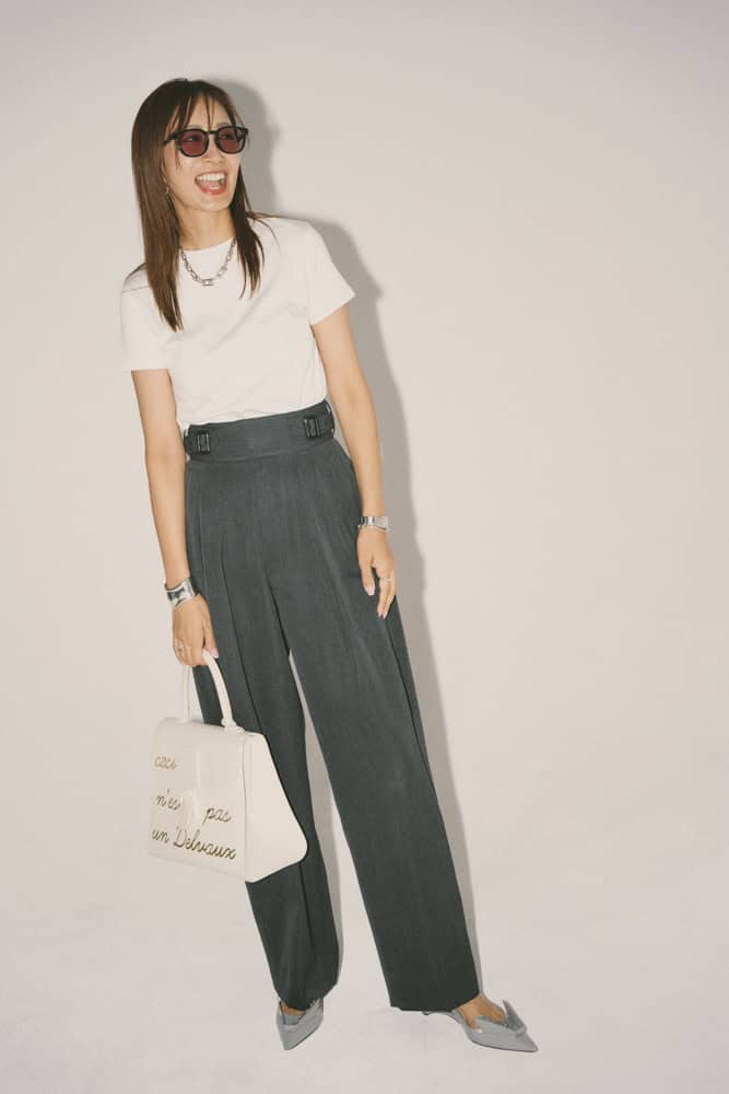 Tシャツとワイドパンツのシンプルなワンツーコーデですが、コンパクトなトップスにハイウエストのボトムスと合わせてスタイルアップを狙いました。靴はボトムスと色を繋げ、足長効果を期待。歩くたびに裾から見える、お花のモチーフがさり気ないポイントに。大きめなバッグとサングラスをコーデに効かせて海外SNAPの雰囲気にしました。