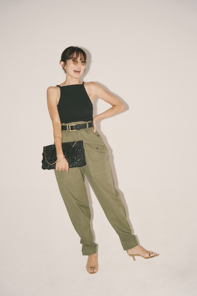 タイトなラインで艶やかなアメリカンスリーブに、敢えてメンズライクなカーゴパンツを合わせてヘルシ―な雰囲気にしました。サングラスのミディアムカーキのレンズとカーゴパンツの色をマッチさせて統一感を意識しました。海外旅行で健康的に焼けた肌に目元もコーデも馴染み、健康的な印象に。