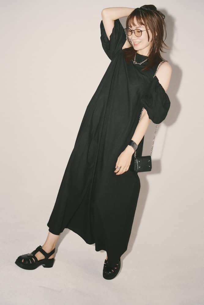毎年、夏に更新するブラックワンピ。今年は肩がチラ見えするパフスリーブのデザインが気に入って購入したアクテのワンピース。普段あまり着ないテイストで、いつもと違う自分に挑戦しました。カジュアルなサングラスとゴツめのシルバーアクセサリーを合わせて自分らしさをプラスしました。アクティブな夏は、サラッと着れる黒ワンピがやっぱり安心。