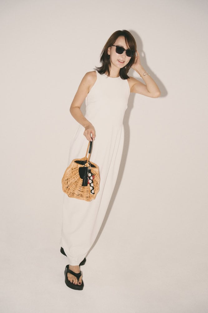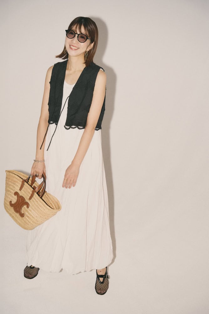 暑いこの季節、夏休みに実家へ帰省するときはワンピースとサングラスでお休み気分を盛り上げつつ、ジレでオシャレ感を出します。爽やかな印象の白ワンピースに黒のジレを合わせることで、サングラスの黒レンズと統一感を出し、顔だけ悪浮きしないように。透明レンズに色が変わると知的な雰囲気になるので、バタバタしがちな帰省時も外すことなく過ごせるのが◎