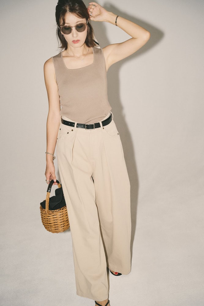 今季の秋物のデニムとタンクトップを合わせて一足早く秋を取り入れた夏コーデに!夏は黒ばかりになりがちなので、淡いベージュ系のワントーンで大人の装いに。髪に巻いたドットのスカーフをアクセントにちょっぴりリゾート感を意識しました。サングラスをかける時は、敢えて顔周りに大きなジュエリーは付けずシンプルに。後ろ髪にスカーフをヘアアクセとして付け、トレンド感をプラスしました。