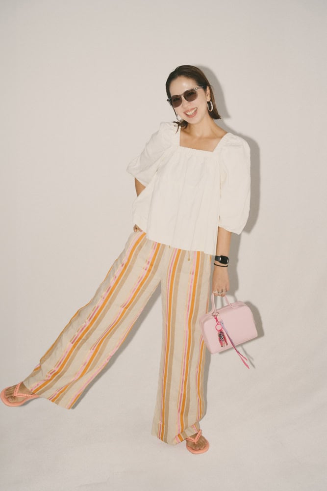 旅行やプールなど、外で過ごす時間の多いシーンはサングラスが必需品。サラッとしたリネンのボトムスは、リゾート感のあるカラフルなリボン生地がアクセントになり、夏の日差しにピッタリです。胸元が大きく開いたパフスリーブのトップスは柔らかい大人可愛い雰囲気に。軽やかなクリアフレームが真夏のファッションを引き立ててくれます。