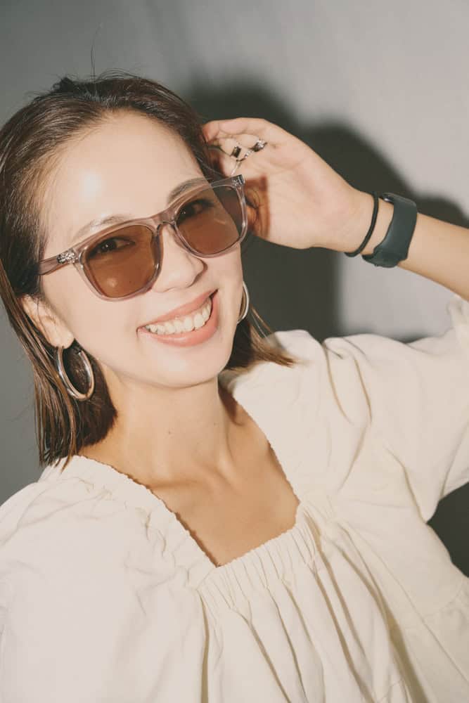 王道なサングラスも好きですが、型にはまらないクリアフレームのサングラスに惹かれました。ベージュで顔馴染みが良さそうなのもポイントで、コントラストが強くないフレームカラーなので肌馴染みが良く、顔写りをパッと明るくしてくれます。サングラスの中でも優しい色合いで、暑い季節でも暑苦しく見えない女性らしさを確保できます。