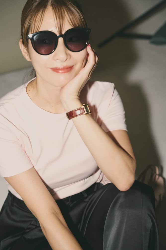 グレーのグラデーションレンズはフルブラックよりも軽やかで、私のヘアカラーと淡いピンクトップスとのバランスもよく選びました。大きめなレンズが夏疲れで毛穴落ちした頬をカバーし、汗のメイク崩れも即席で隠せるため、サングラスは夏場のお助けアイテムです。甘いコーデをする日はマニッシュアイテムを取り入れて甘さを抑えることが多く、このサングラスは品もありながらクールに見せてくれるので、糖度調節に使えるアイテムです。