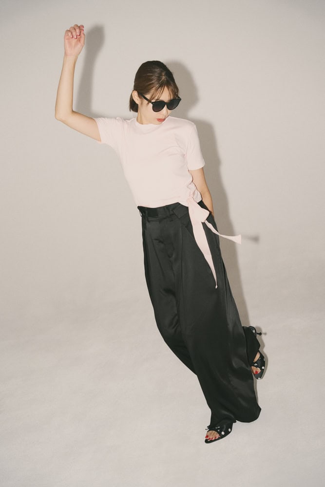 黒のフレームに合わせて、ボトムスをブラックに。印象が強い目元に対して、コーデにディテールが多いと要素過多になりそうなので、甘すぎるアイテムは避けました。光沢のあるパンツでモードに寄せつつ、ウエストにピンクリボンが付いたTシャツで少しだけ甘さをトッピング。足元にはドットのサンダルを効かせて遊び心を。クールな顔回りを中心として、甘さ要素をほんの少し引き算した着こなしを心がけました。