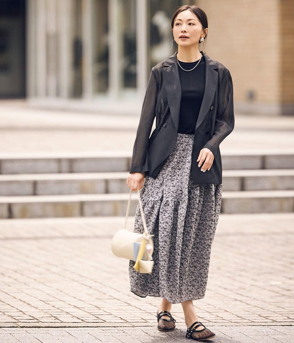 仕事や学校行事など、きちんと感を保ちつつアクセントも欲しい…そんな時におすすめなのが、モノトーンの花柄。主張しすぎずにしっかり華やかで、ジャケットスタイルに優しい表情も添えてくれます。スタイリング次第で、休日コーデにもお出かけにも着回せる、万能アイテムです。