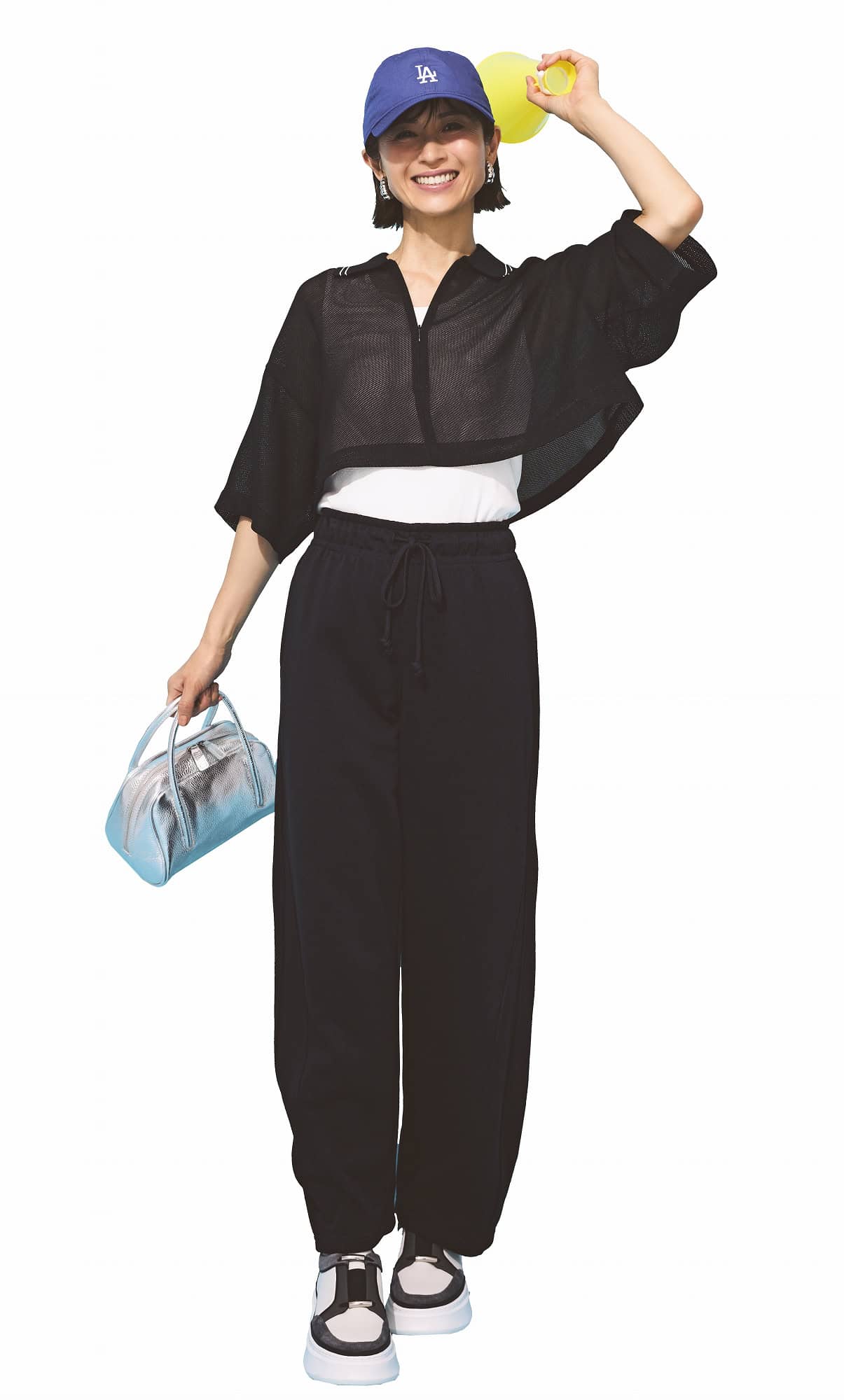 メッシュポロ¥7,480(STYLEMIXER)2WAYタンクトップ¥4,990(PLST)スウェットパンツ¥2,990(GU)バッグ¥23,100〈AULENTTI〉スリッポン¥13,750〈ル タロン〉(ともにル タロン 有楽町マルイ店)キャップ¥4,840(ニューエラ × マイカ アンド ディール/マイカ アンド ディール 恵比寿店)イヤリング¥8,800(アビステ)