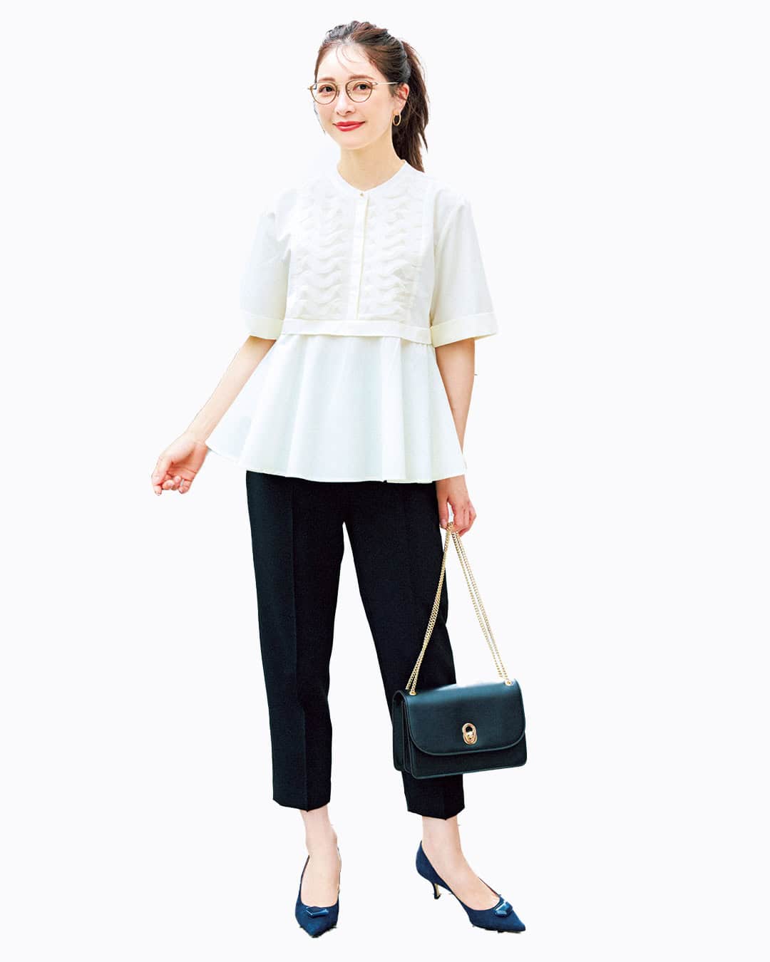 【写真2枚目】ブラウスは色違い。パンツ¥22,990(アンクレイヴ/アンクレイヴ〈オンワード樫山〉)バッグ¥13,750(アルテミス by ダイアナ/アルテミス by ダイアナ アーバンドックららぽーと豊洲店)メガネ¥39,600(ブラン/ライト)ピアス¥99,000(ココシュニック)シューズ/スタイリスト私物