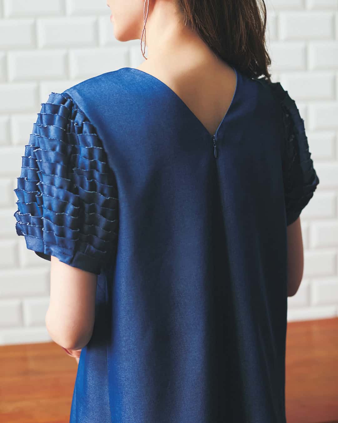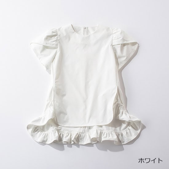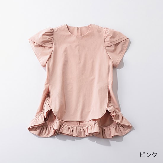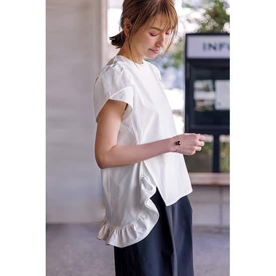 ➀袖や裾のディテールが効いて体型カバーもできる「フリルトップス」