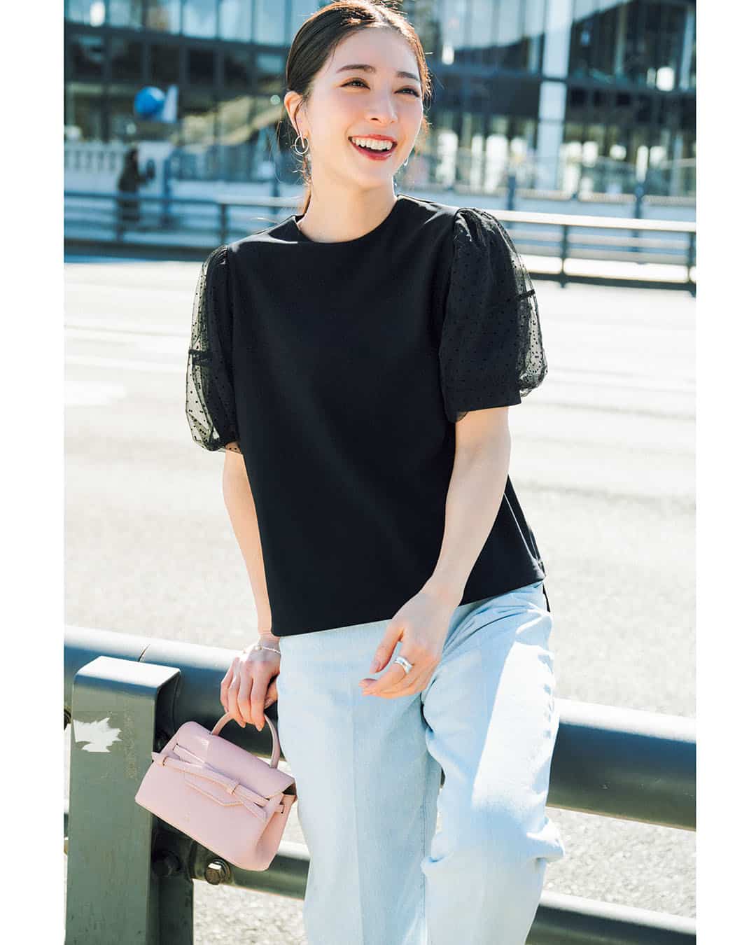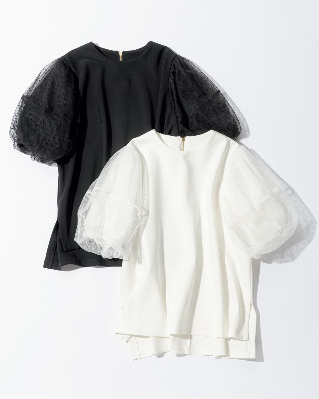 ②ワンツーコーデでもサマ見え!華やか「ドットチュールプルオーバー」