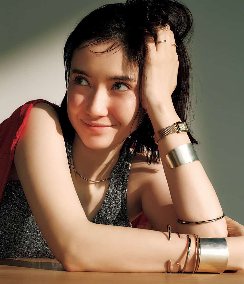 時計[SUS、チタンYGコーティング]¥28,600バングル〈左腕下〉[SV925、Ptコーティング]¥39,600〈右腕左1番目〉[SV925、Ptコーティング]¥29,700〈右腕左から3番目〉[SV925、Ptコーティング]¥27,500〈右腕左から4番目〉[SV925、YGコーティング]¥14,300〈右腕左から5番目〉[SV925、Ptコーティング]¥14,300薬指リング[K18YG]¥82,500(すべてete)バングル〈左腕中央〉[リサイクルシルバー925]¥39,600〈右腕左から2番目〉[リサイクルシルバー925、RBGコーティング]¥18,700〈右腕左から6番目〉[リサイクルシルバー925]¥47,300ネックカフ[リサイクルシルバー925、RBGコーティング]¥26,400人差し指リング[K18YG、ダイヤモンド]¥39,600(すべてete bijoux)
