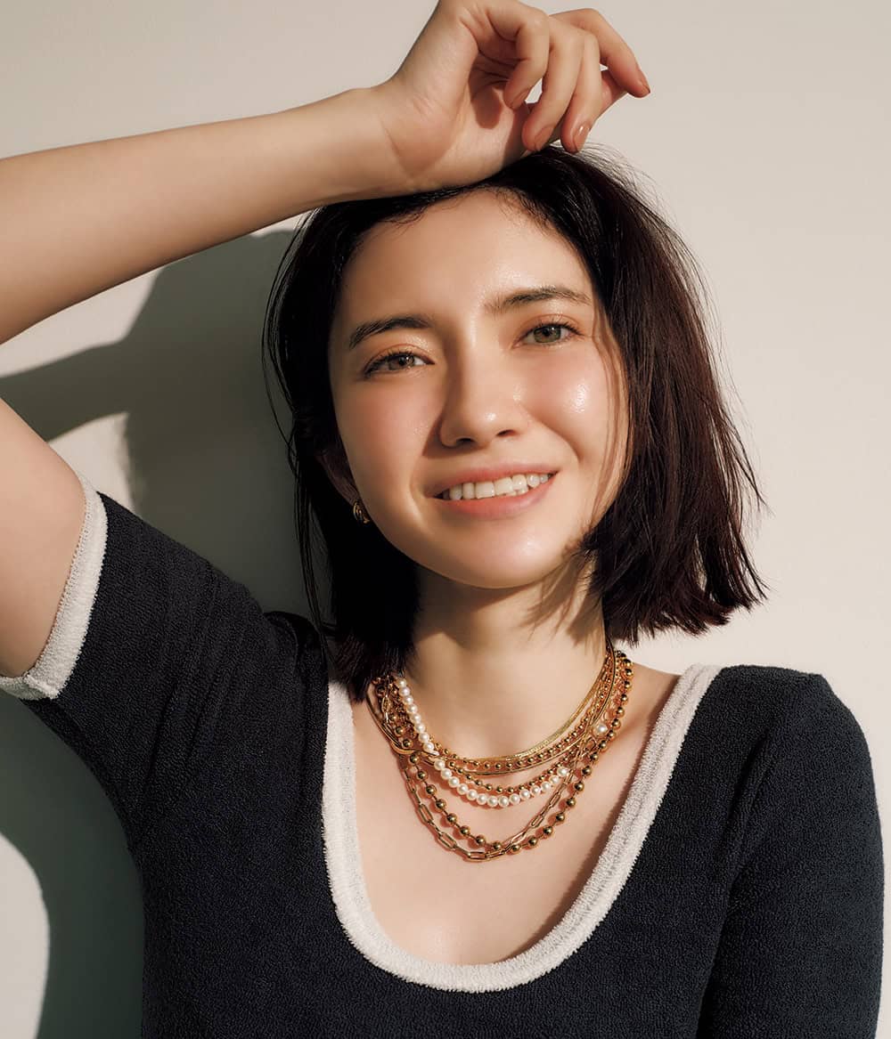 夏の胸元には華奢な3本レイヤードでVラインを意識して。たるみや緩みがあるからこそ、「線の美しさ」を印象づけられます。(スタイリスト・竹村はま子さん)
