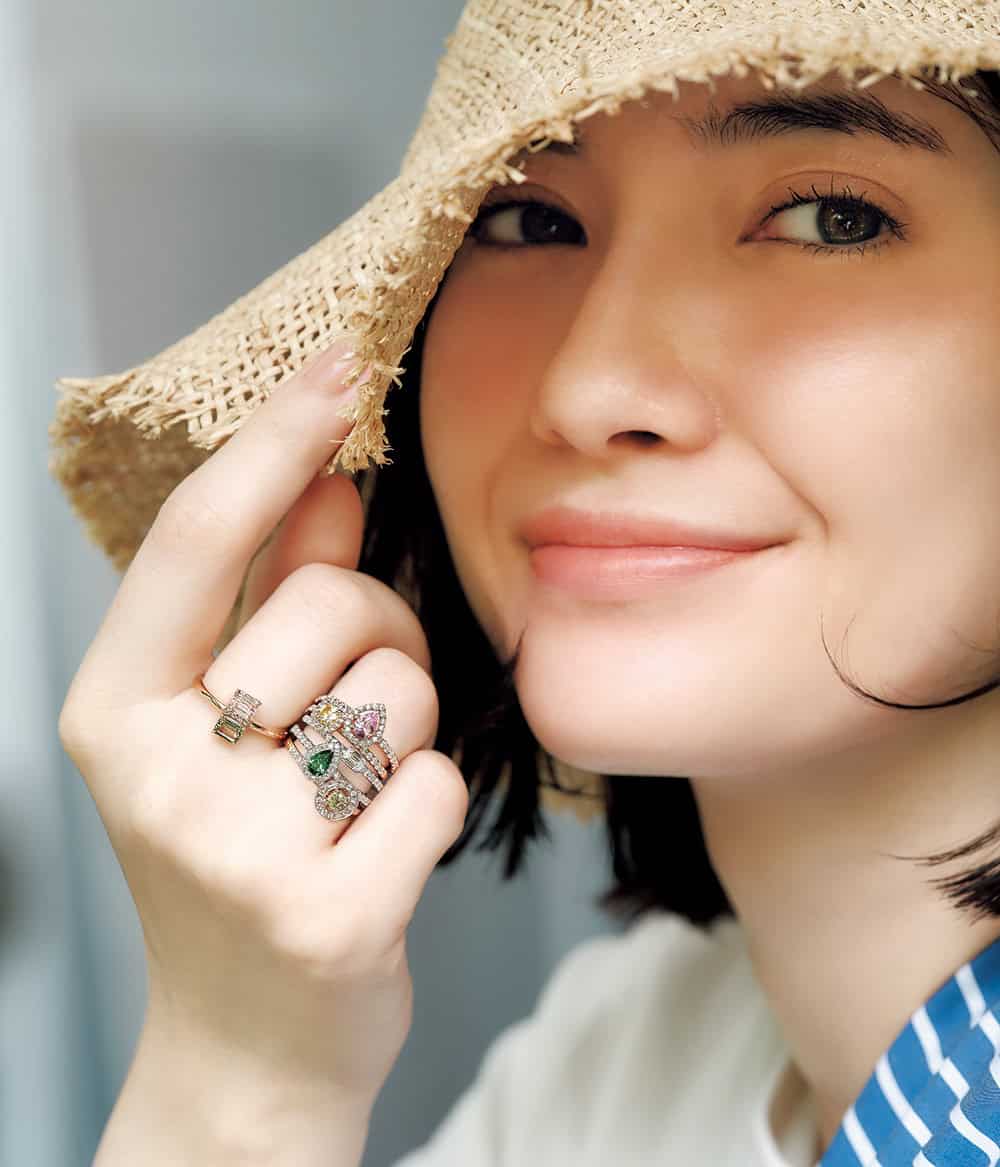 薬指リングすべて「ラ・リーニュ」【上から】[K18PG、サファイア×DIA]¥550,000[K18PG、サファイア×DIA]¥495,000[Pt950、DIA]¥429,000[Pt950、ガーネット×DIA]¥495,000[K18PG、サファイア×DIA]¥440,000中指リング「パルフェ」[K18PG、サファイア×DIA]¥550,000(すべてNADIA/Maison de NADIA 銀座本店)シャツ¥25,300〈プロヴォーク デザイン ブティック〉ハット¥24,200〈ラック オブ カラー〉(ともにジャック・オブ・オール・トレーズ プレスルーム)Tシャツ¥11,000(ザ シンゾーン/シンゾーン ルミネ有楽町店)