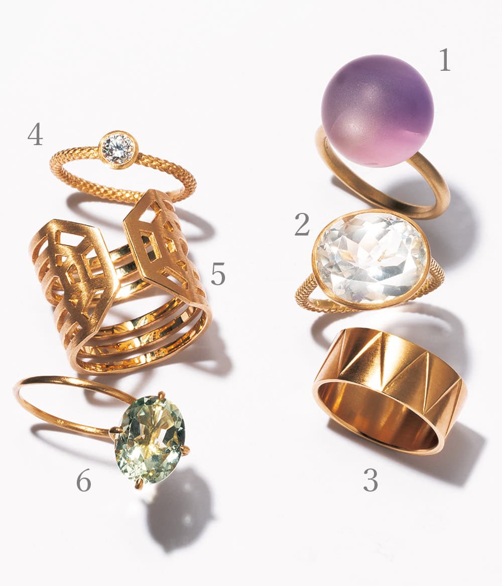 1.リング[アメジスト×SV×K18YGメッキ]¥123,200(ボロロ)2.リング[K18YG×ホワイトムーンストーン]¥363,000 3.リング[K18YG]¥396,000 4.リング[K18YG×DIA]¥495,000 5.リング[K18YG]¥462,000 6.リング[K18YG×グリーンアメジスト]¥145,200(すべてトーカティブ/すべてトーカティブ 表参道)