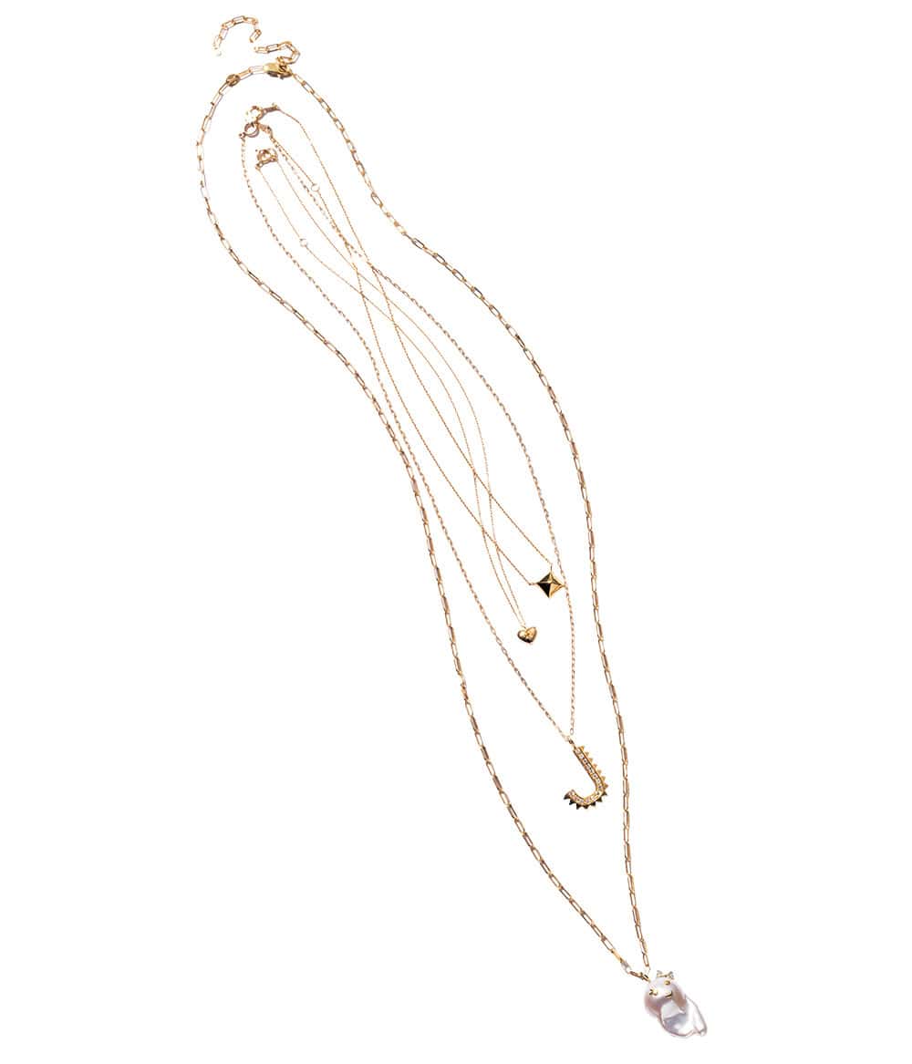 四角ネックレス[K18YG]¥165,000細チェーンネックレス[K18YG]¥94,600 Jチャー[K18YG×DIA 0.18ct]¥297,000太チェーンネックレス[K18YG、80㎝]¥572,000おばけチャーム[K18YG×淡水真珠バロック×DIA]¥154,000(すべてカドー/CADEAUX六本木ヒルズ店)ハートネックレス[K18YG]¥110,000(マリハ)