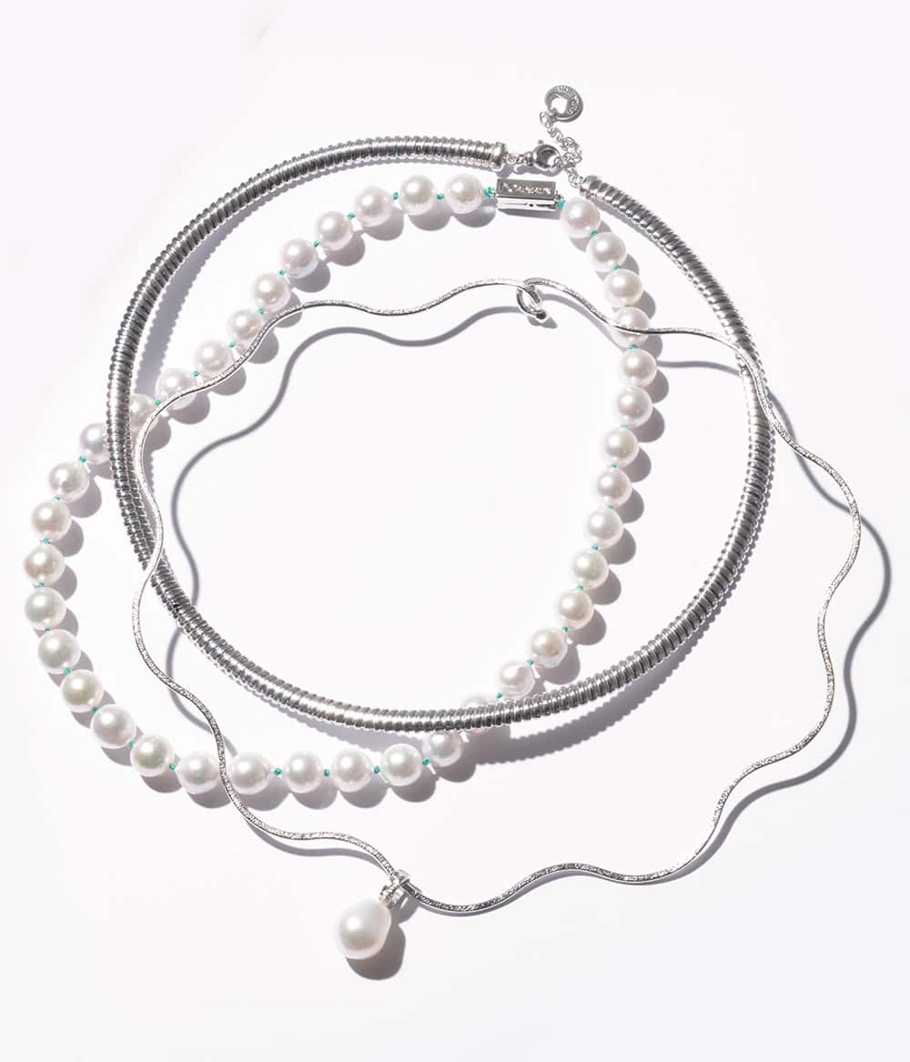 【上から】太ネックレス[SV925]¥66,000(ウノアエレシルバーコレクション/ウノアエレジャパン)パールネックレス[シルバー925×あこや真珠、グリーンシルク糸]¥121,000(カドー/CADEAUX六本木ヒルズ店)チョーカー[SVPTコーティング×パール]¥49,500(カラットアー/イセタンサローネ東京)