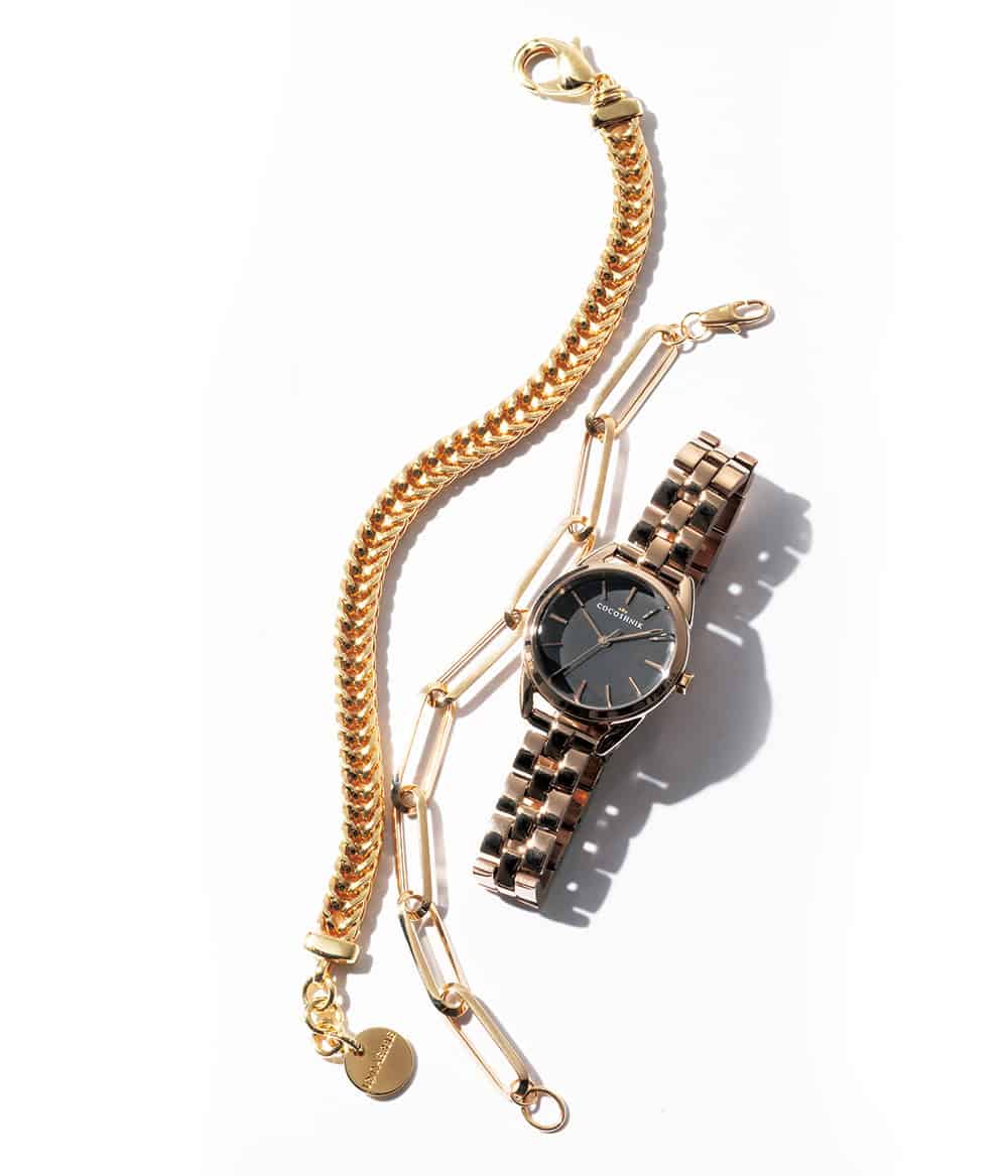 【右から】時計¥37,400ブレスレット[K18]¥297,000(ともにココシュニック)ブレスレット[真鍮・K18コーティング]¥15,400(ワンエーアールバイウノアエレ/ウノアエレジャパン)