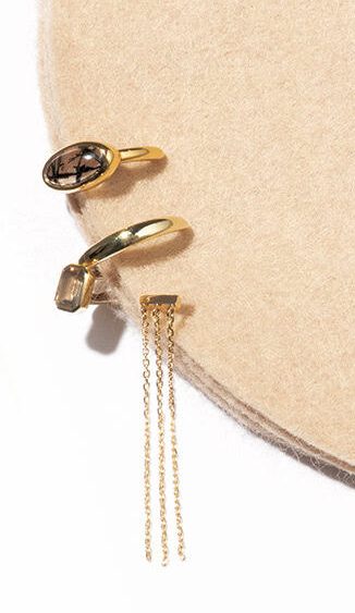 【上から】イヤーカフ[シルバー、K18YGコーティング、クォーツ]¥19,800イヤーカフ[シルバー、K18YGコーティング、スモーキー・クォーツ]¥15,400ピアス※片耳用[K10YG]¥15,400(すべて4℃〈エフ・ディ・シィ・プロダクツ〉)