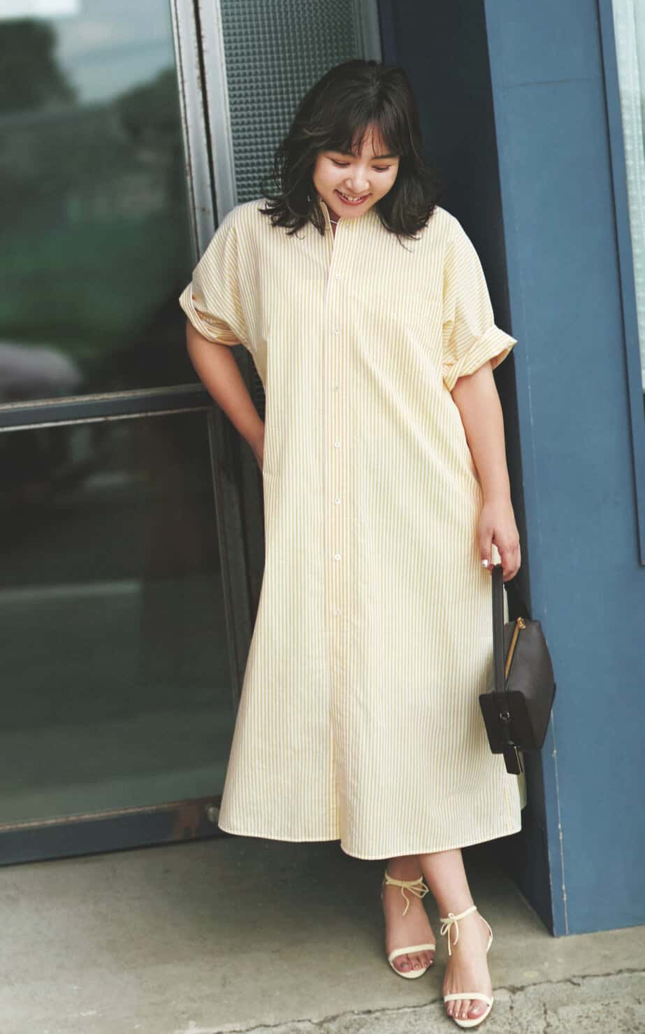 レモンイエローのシャツワンピ。縦ラインのストライプ柄で着太りしがちな淡色ワンピも細見え効果UP!二の腕を覆う長めの袖丈や足元に向かって広がるシルエットは、体型を拾わず、しっかりカバー。ゆったりとした着心地で、安心感も。