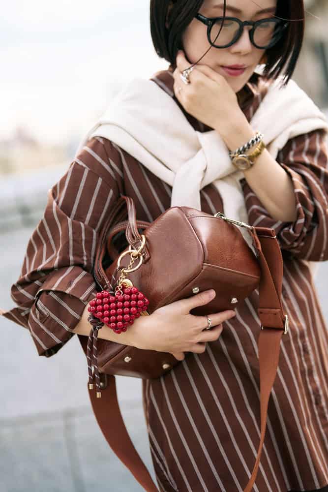 大きめなハートに一目惚れしたバッグチャームはZARA。バッグは存在感のあるフォルムやショルダー部分のデザインが気に入って購入しました。今年の秋冬は茶色しか着ない!というぐらいの勢いで、大好きなブラウンアイテムを集めています。落ち着いたトーンのスタイルに合わせることで赤いチャームがより素敵に引き立ちます。