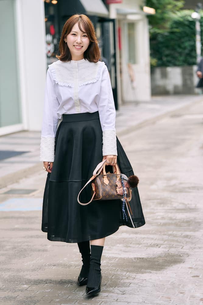白ブラウス+ふんわりスカートの王道なクラシックコーデには小物で遊び心をプラス。一目惚れしたお茶目なリスのチャームはH&Mで見つけたもの。リスを主役に統一感のあるカラーでまとめ、ふわふわのファーチャームで秋っぽさもプラスしました。