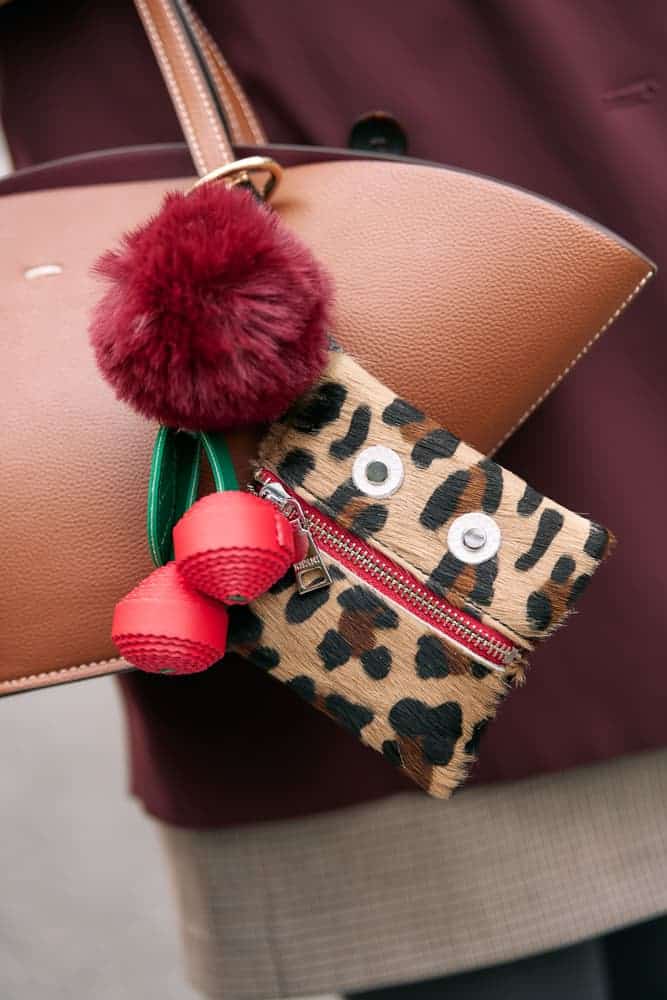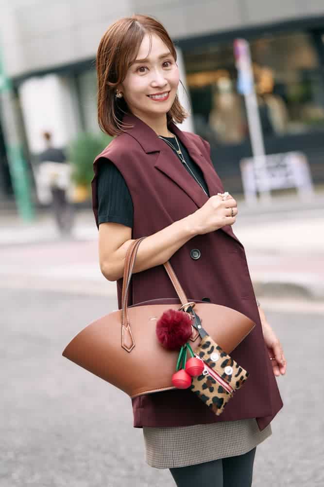 ブラウン&ボルドー&アニマルで秋っぽさと華やかさを意識。ファーのチャームとジレでカラーリンクして統一感を出しつつ、お目目の愛らしいチャームで遊び心は忘れません。それぞれのチャームがバランスよく引き立て合う、こだわりのバッグコーデです。