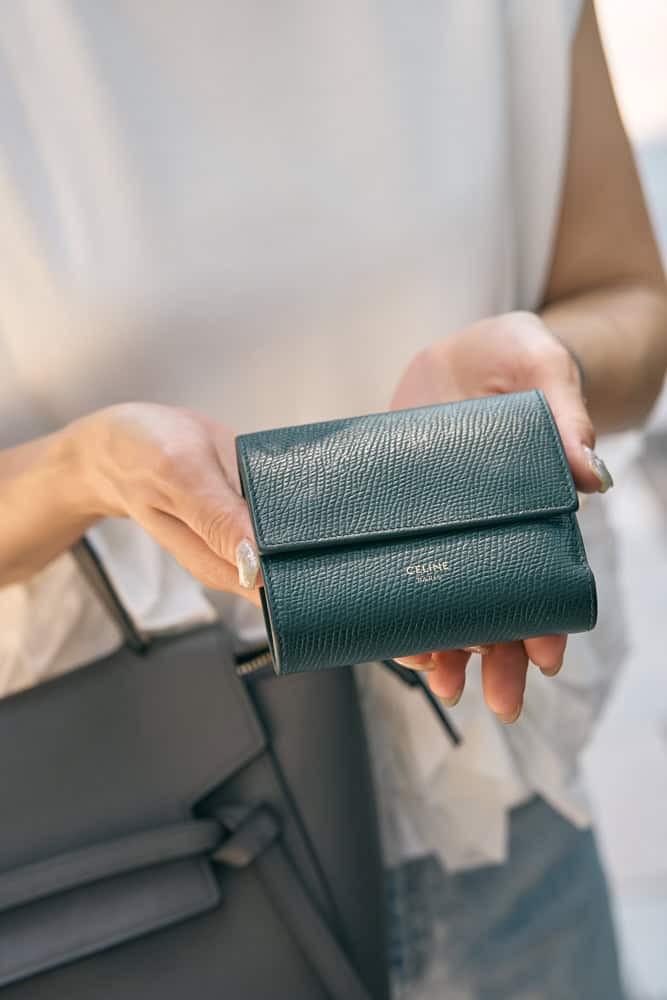 コンパクトなのに存在感のあるセリーヌのミニウォレット。落ち着いたグリーンが上品ながらもさりげないアクセントに。どんなシーンにもコーデにもしっくり馴染み、嵩張らないのにしっかり収納できるところも優秀です。