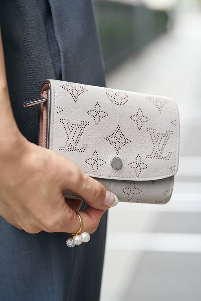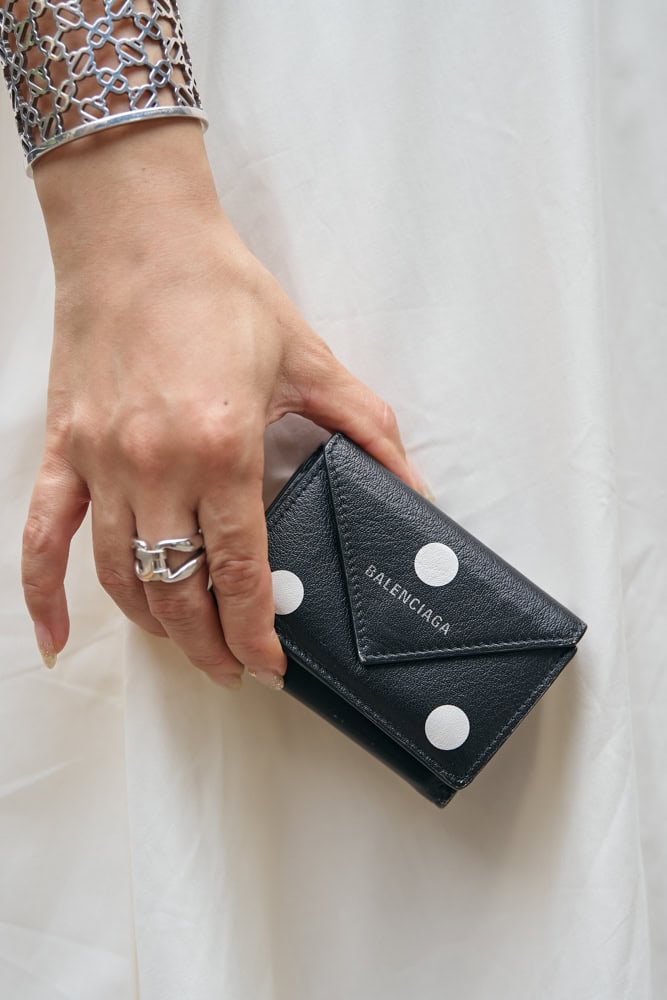 バッグがコンパクトなので、お財布もミニサイズをセレクト。バレンシアガのミニ財布は、小さいながらもたっぷり収納ができ、とても使い勝手が良く重宝しています。モノトーン好きの私は、黒地に大きめの白ドット柄を選びました。数年前に購入したアイテムですが、飽きることなく今でもお気に入りです!