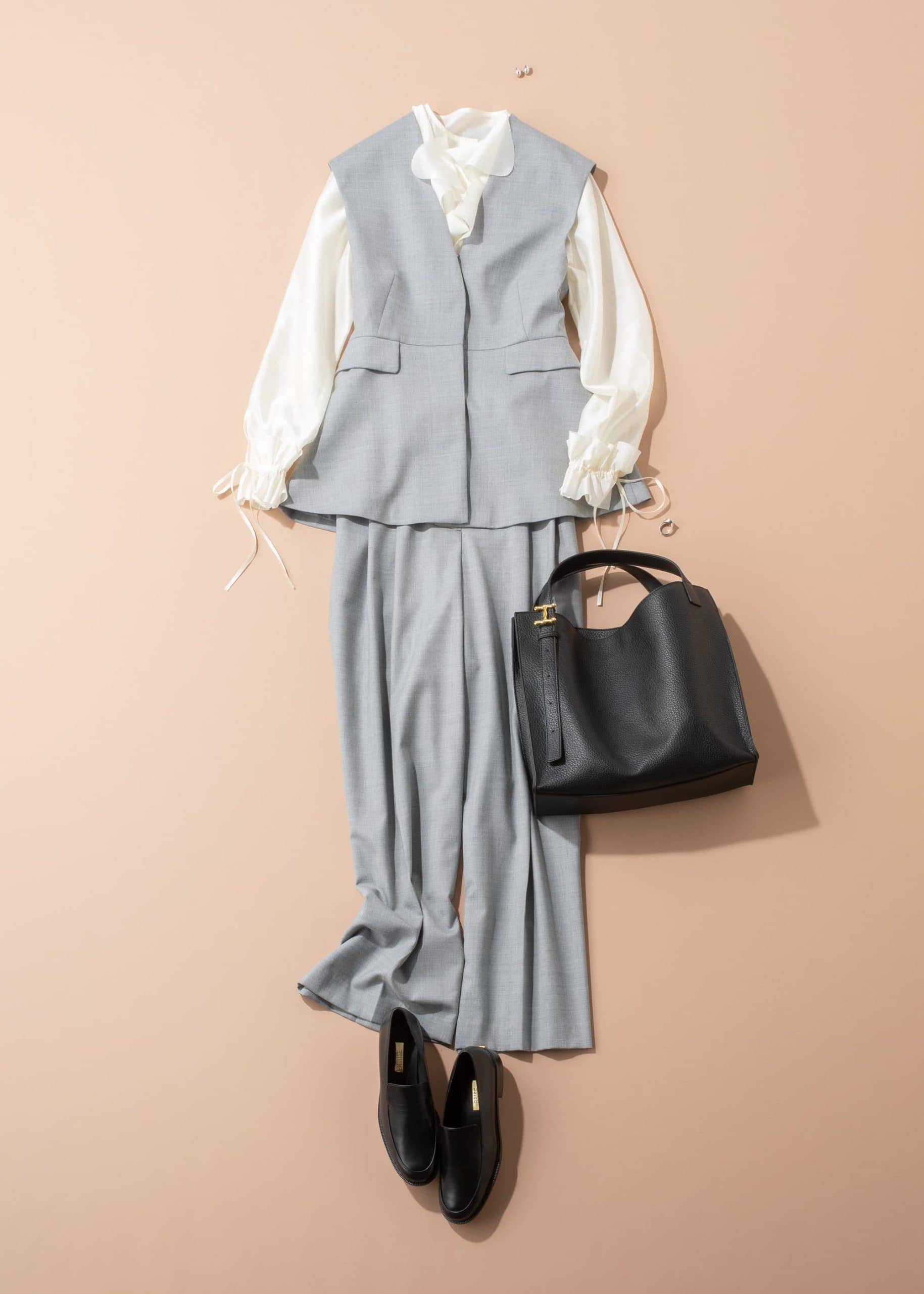 ウエストにくびれのあるジレと甘めのブラウスの合わせが、女性らしさを残しながらも誠実な印象になるのは、オフィスコーデと好相性なクラシカルローファーだからこそ。