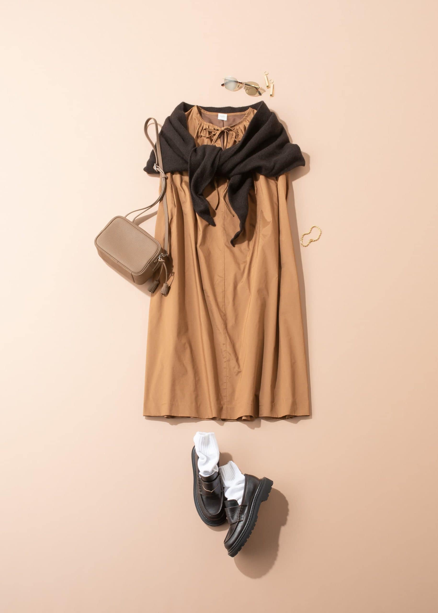 ローファー(上と同じ)ワンピース¥51,700(エッフェ ビームス/ビームス公式オンラインショップ)ストール¥37,400(アソース メレ/アイネックス)靴下¥4,180(ハイク/ボウルズ)バッグ¥39,600(ヴァジック/ヴァジックジャパン)サングラス¥41,800(ワンスリー コンバウンド フレーム/デュアル)ピアス¥15,400ブレスレット¥14,300(ともにワンエーアールバイウノアエレ/ウノアエレ ジャパン)