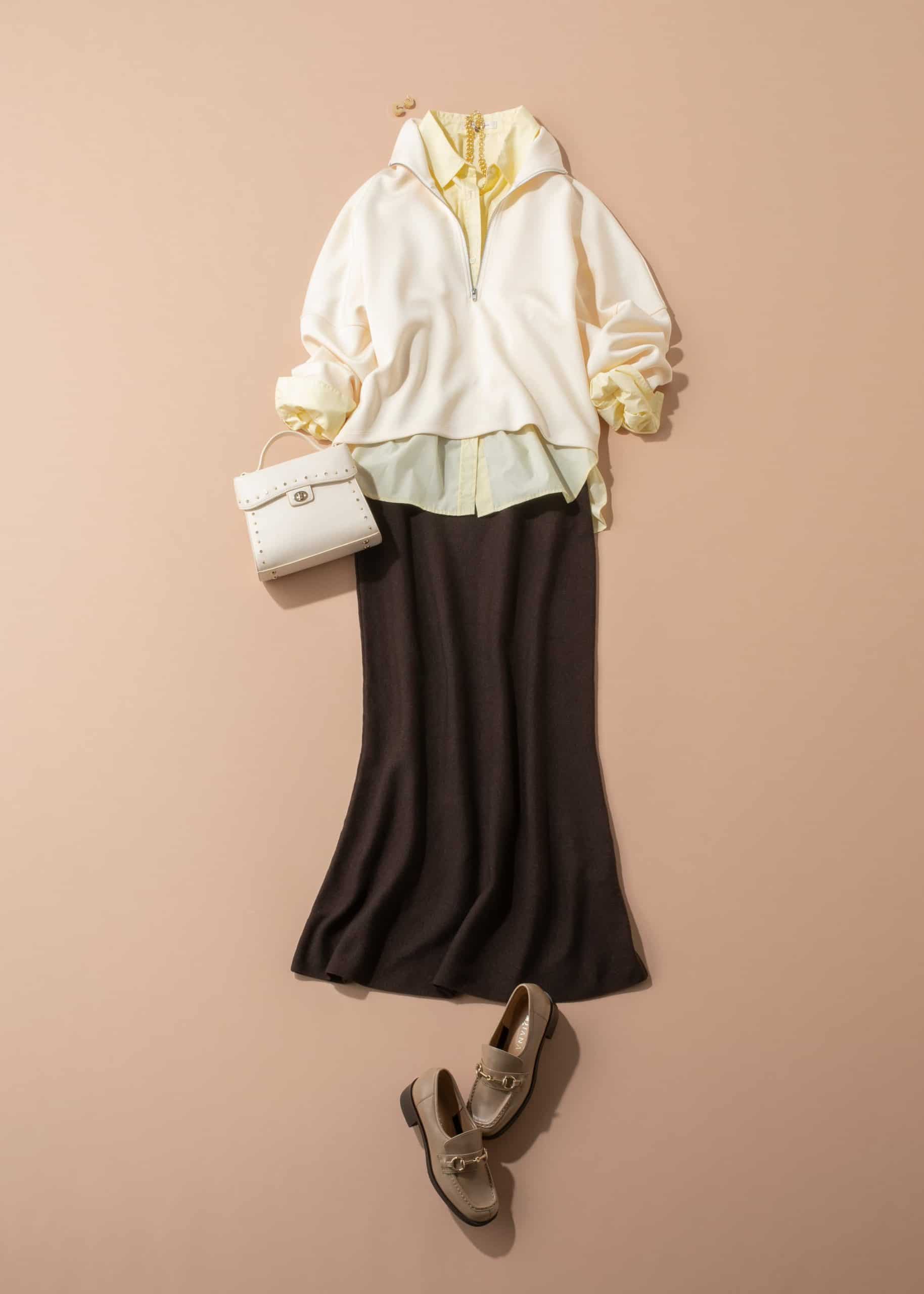 ローファー(上と同じ)バッグ¥15,950(ダイアナ 銀座本店)プルオーバー¥7,920シャツ¥8,250〈ともにアバハウス マヴィ〉スカート¥16,500〈ルージュ・ヴィフ アンナ〉(すべてアバハウスインターナショナル オンラインストア)ピアス¥335,500〈ウノアエレ〉ネックレス¥16,500〈ワンエーアールバイウノアエレ〉(ともにウノアエレ ジャパン)