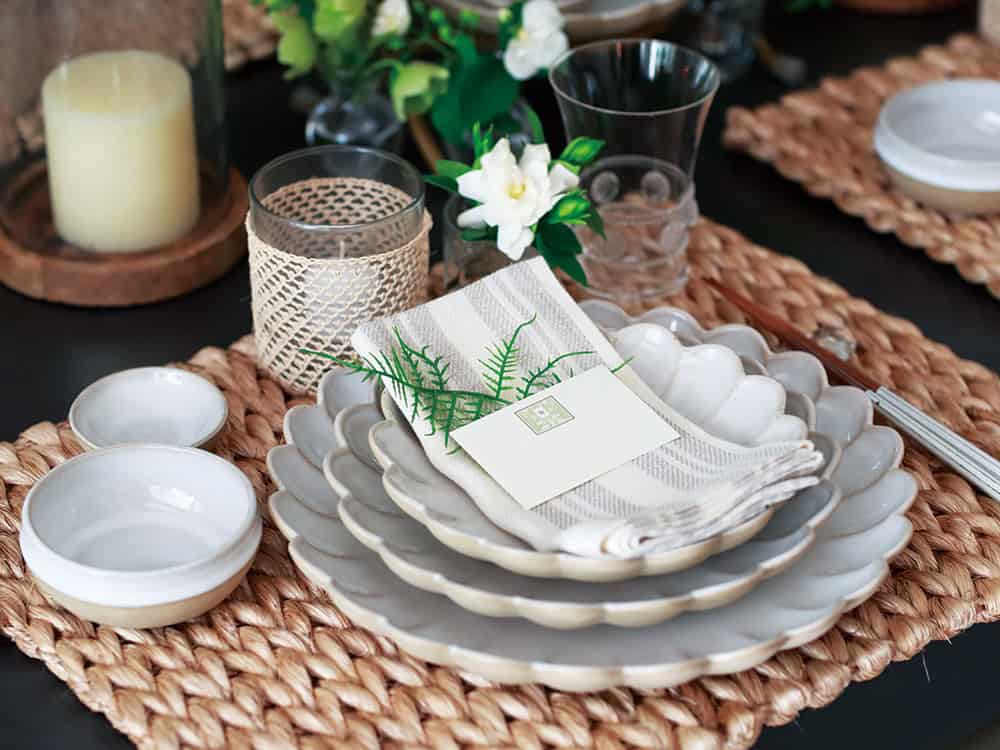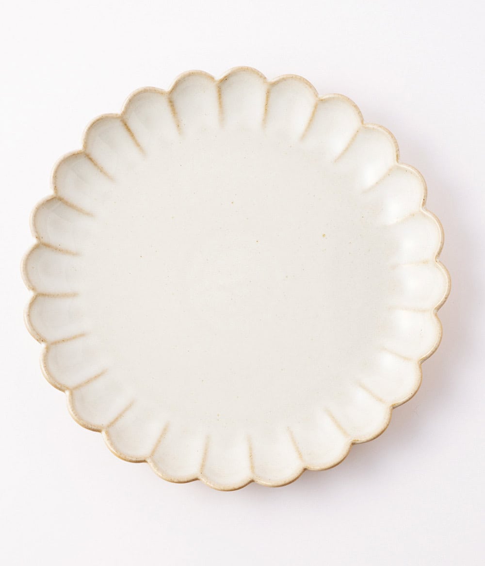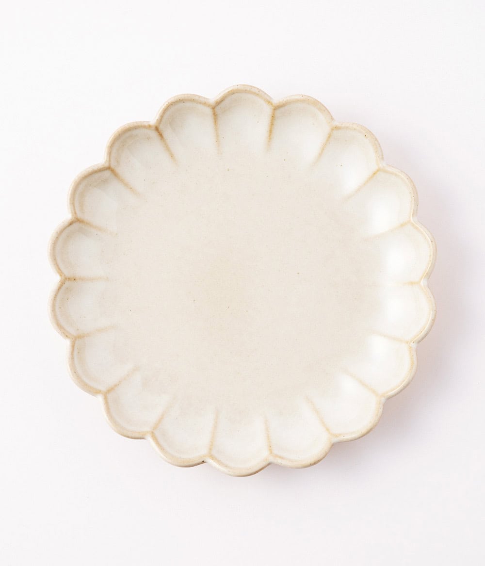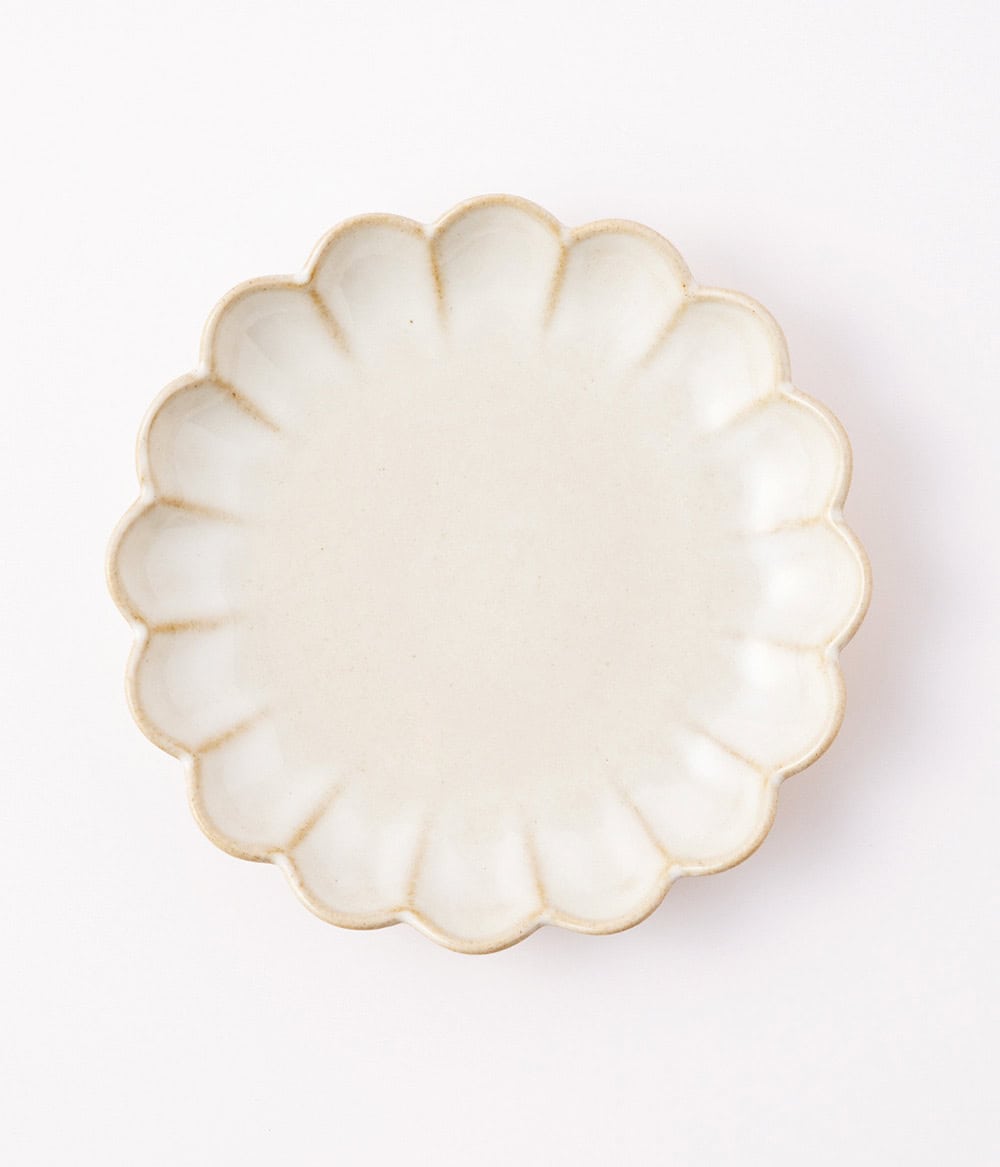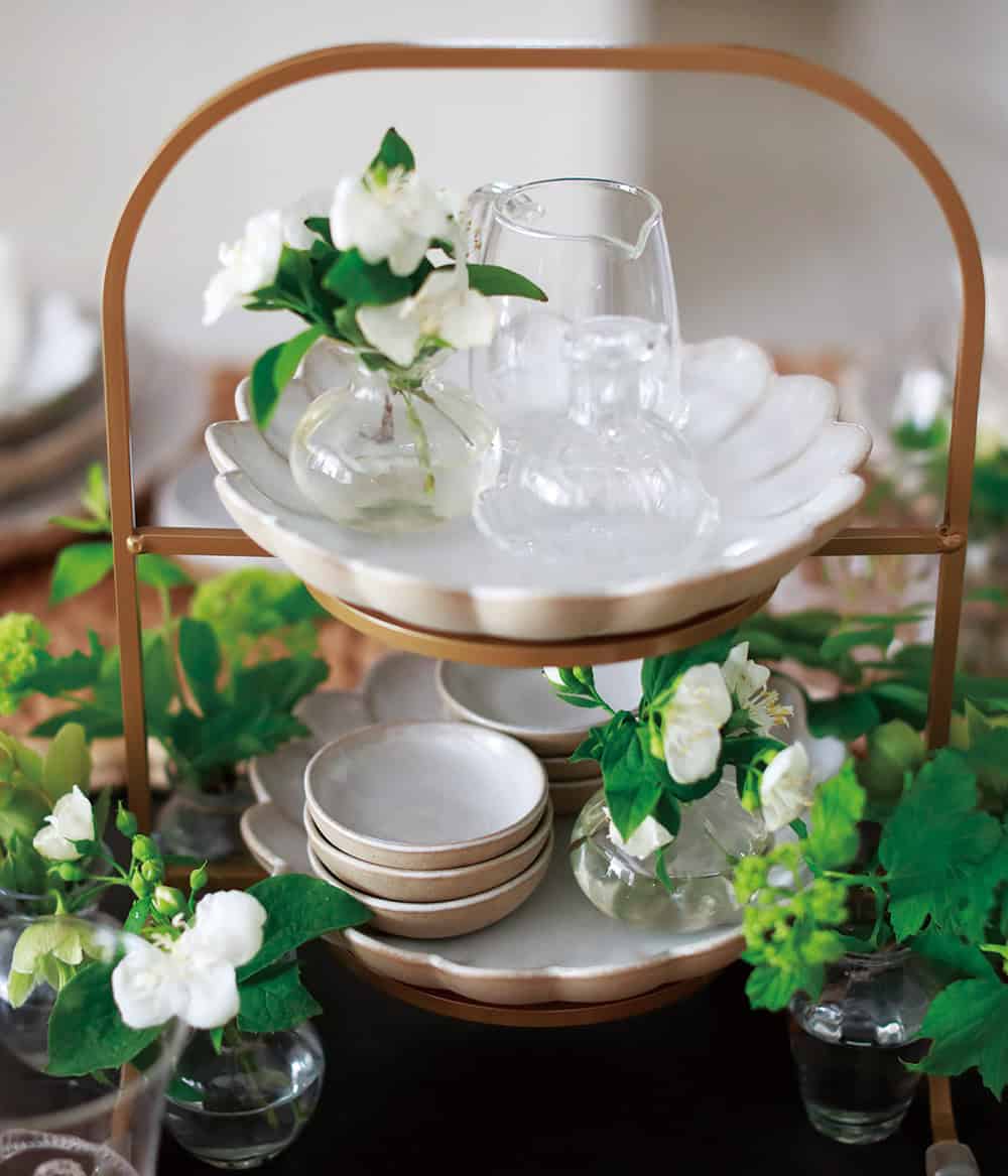 端が立ち上がった花びら形のお皿は、重ねると一層優雅に。上のお皿を外せば、下のお皿をすぐ使えるので、替える手間がなく便利です。
