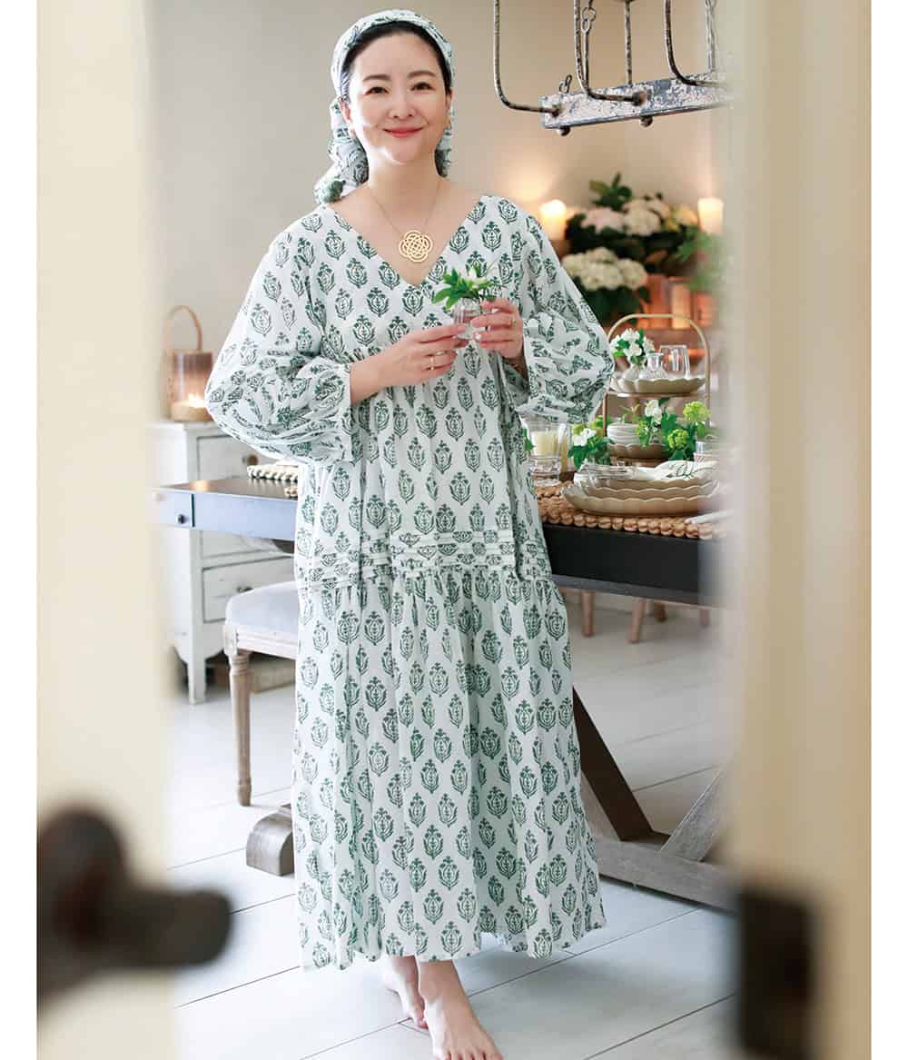 Vネック&切り替えで細見えするワンピに、同柄ストールのヘア使いで華やかに。動きやすい九分丈バルーン袖が二の腕を大人可愛くカバー。