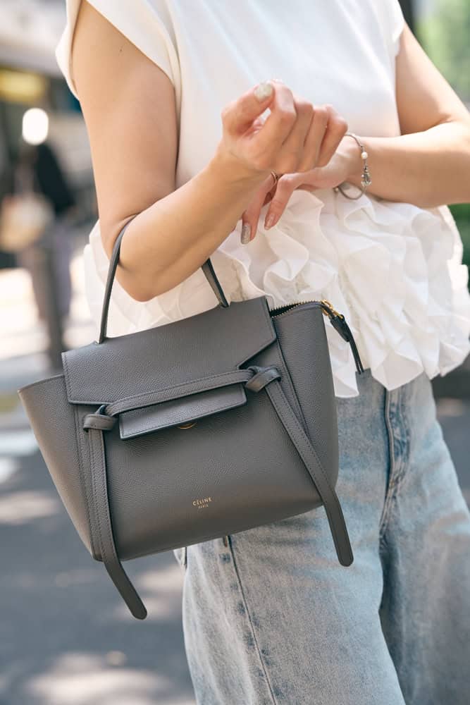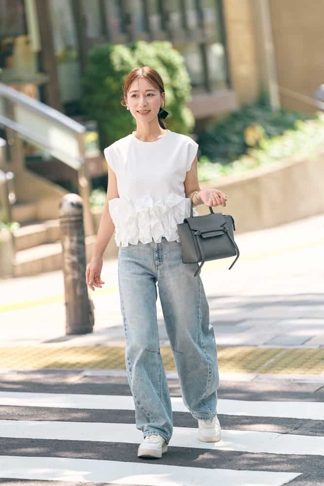 カジュアルなデニムとスニーカーコーデも、フリル付きトップスを合わせれば一気に華やぎモードに。涼しげなホワイトトップスで夏らしさを添えつつ、きちんと感漂うCELINEのバッグで大人っぽく引き締めました。