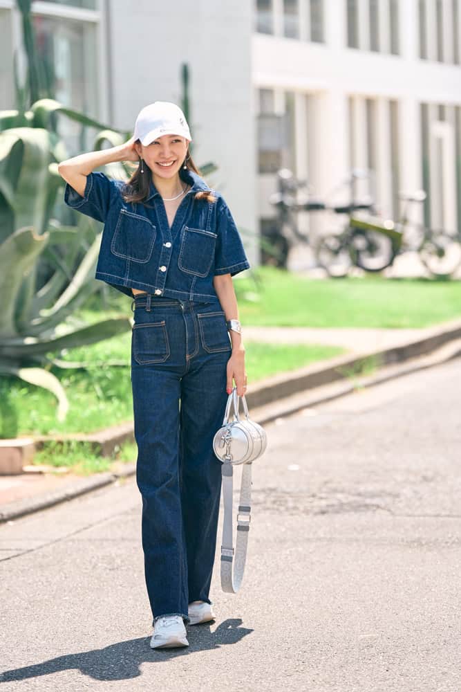 難しそうに見えるデニムonデニムも、インディゴの同系トーンで揃えればこなれた印象に。クロップド丈トップス×ハイライズボトムスのバランスが自然にスタイルアップも叶えます。デニム×白×シルバーの爽やかな配色にして、夏らしく軽やかに仕上げました。