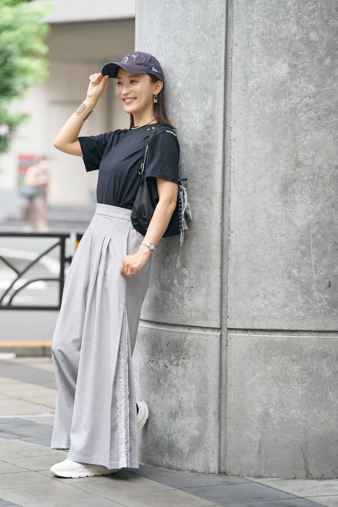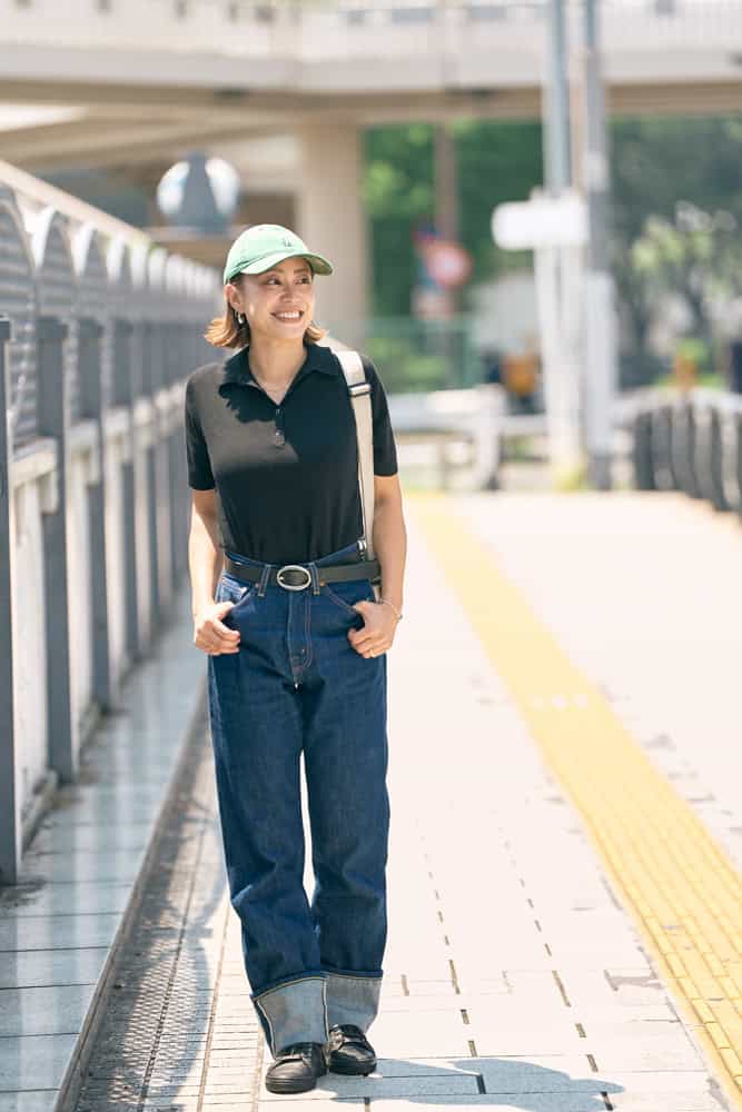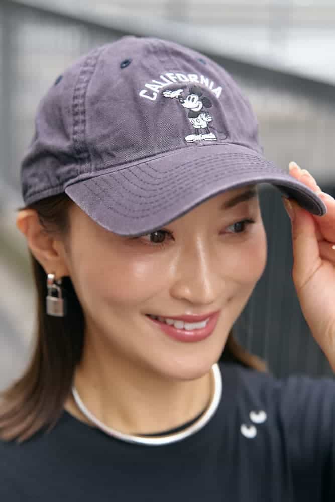 キャップ×スニーカーの日こそ、パンツはほんのりきれいめを意識して大人のバランスに。数年前にDisneylandで購入したニューエラのキャップは、公園でも旅行でも頼れる私の相棒。バッグにはトレンドのチャームを添えて、シンプルなカジュアルに遊び心と今っぽさをプラスしました。