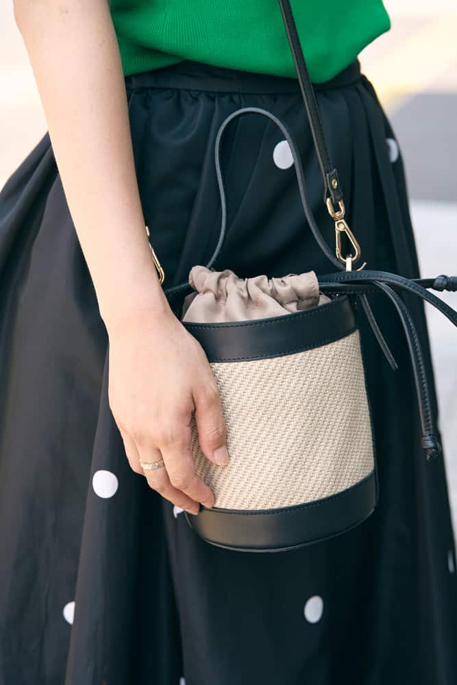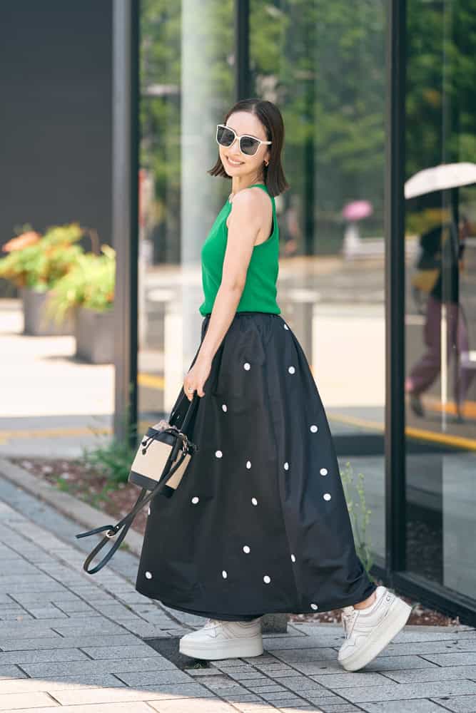 好きなカラーナンバーワンのグリーントップスと、夏らしく白縁サングラスを合わせぐっとオシャレ度をアップ!シワにならないボリュームスカートは、着心地楽ちん&涼しいのが嬉しいポイント。スニーカー合わせでも着るだけでパッと華やぐから、ご近所コーデにもぴったりな優秀アイテムです。