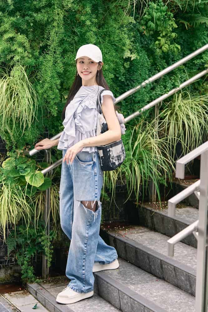 近所へのお出かけも、ほんのひと工夫でおしゃれ見えが叶います。アシンメトリーなフリルが華やかなトップスに、涼しげカラーを合わせれば、夏のご近所コーデも軽やかに。白キャップで顔まわりを明るく見せつつ、日差し対策も抜かりなく。ラフすぎず、実用性とおしゃれ感を両立したデニムコーデです。