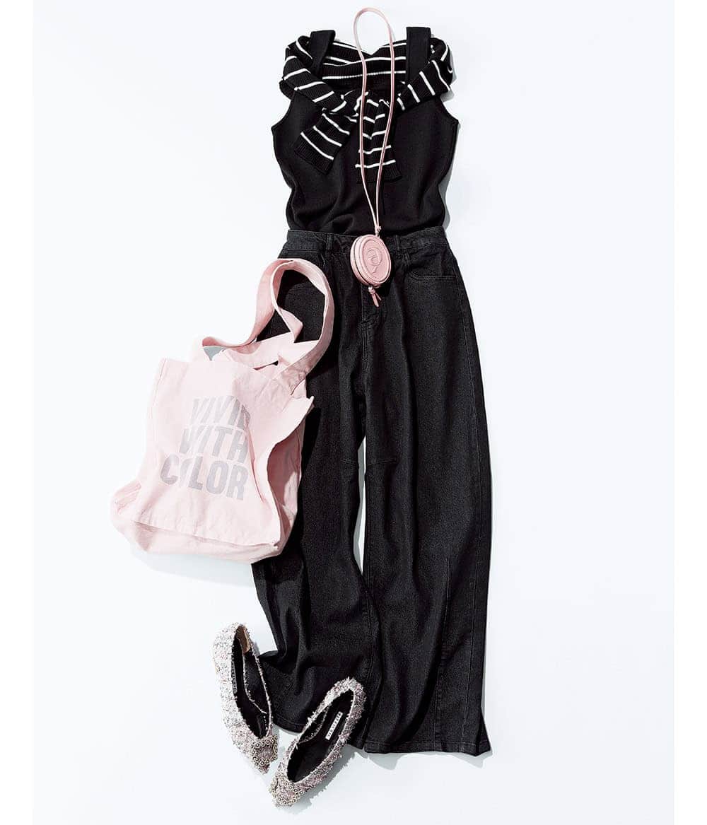 デニム¥4,290(神戸レタス)ニットタンクトップ¥12,100(アンクレイヴ)肩掛けにしたカーディガン[UVカット・マシンウォッシャブル]¥1,990(GU)マイクロミニバッグ¥11,550(アーカイブエプク)トートバッグ¥8,800(マイカ アンド ディール/マイカ アンド ディール 恵比寿店)パンプス¥42,900(ピッピシック/ベイジュ)