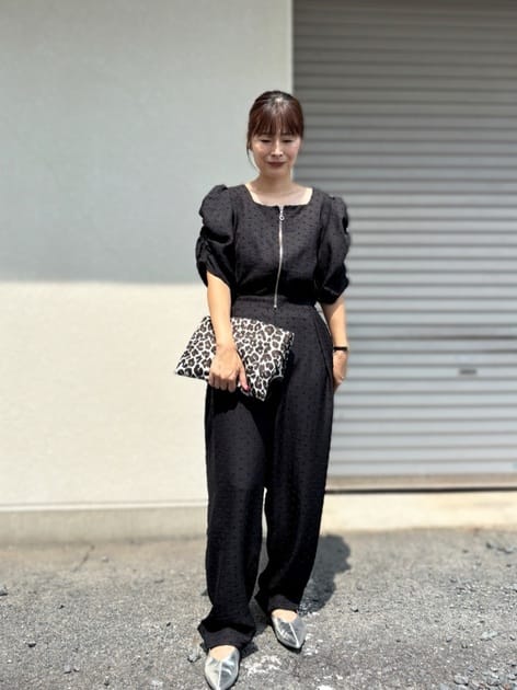 「夏〜秋まで使えるほぼ黒コーデ。1枚でコーデが完成するので、クラッチバッグとメッシュパンプスを合わせただけの時短スタイル。忙しい日の通勤コーデにもなる強い味方です。秋口はカーデやジャケットONで着たい!」