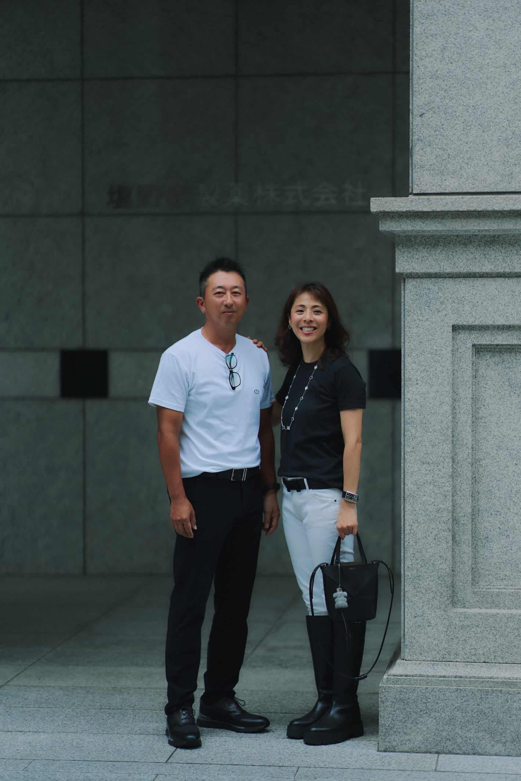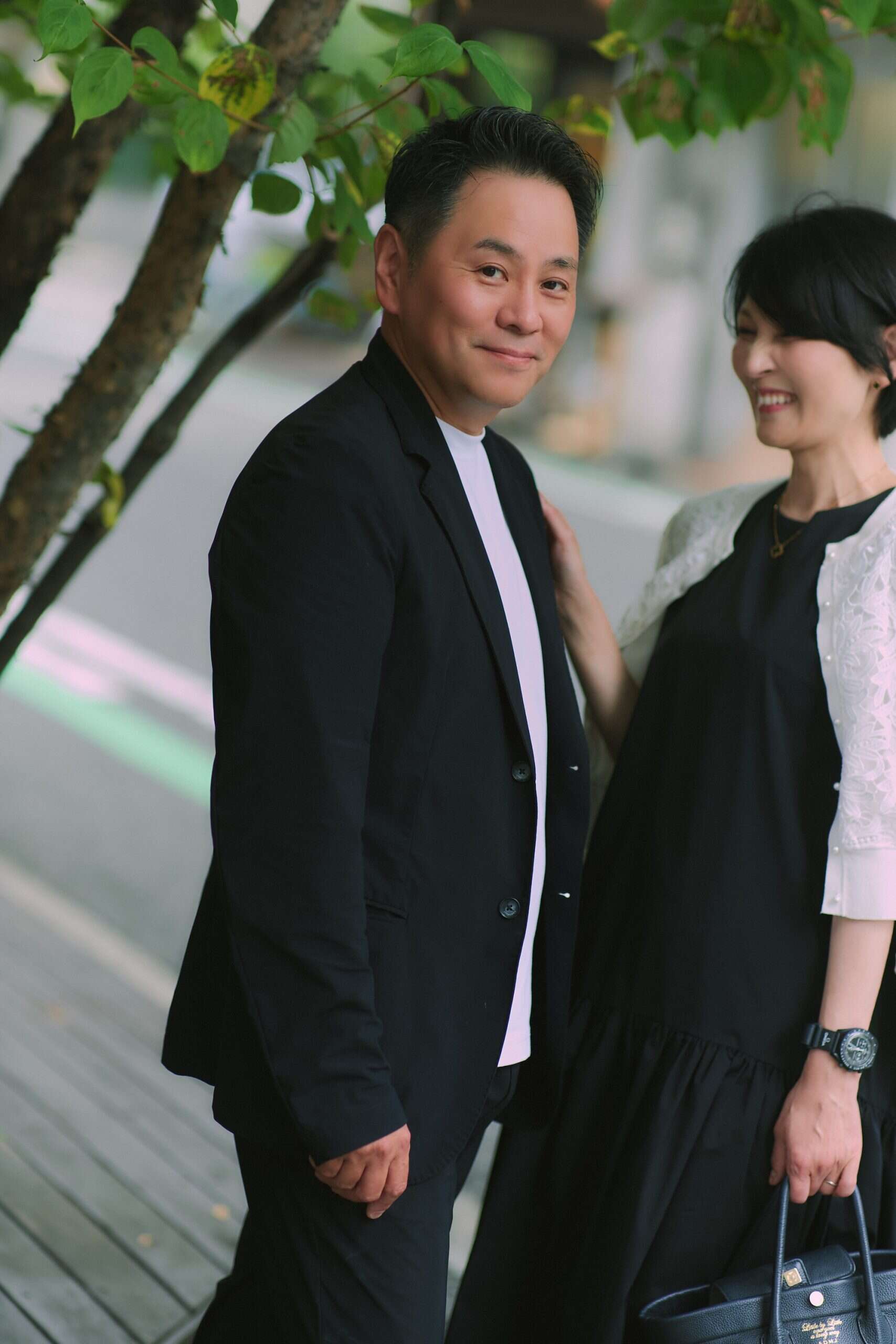 ほぼ黒のコーディネートが今っぽく、スレンダーなスタイルが映える理江さんの横に、笑顔で並ぶご主人の幸彦さん。パリッとした質感、Wポケットのカジュアル感が、二人をトータルでオシャレに見せている理想の大人夫婦コーデ。際立つシャツのホワイトとモードなブラックセットアップの二人を、芦屋のジャックデコさんの前でSNAPさせてもらいました。