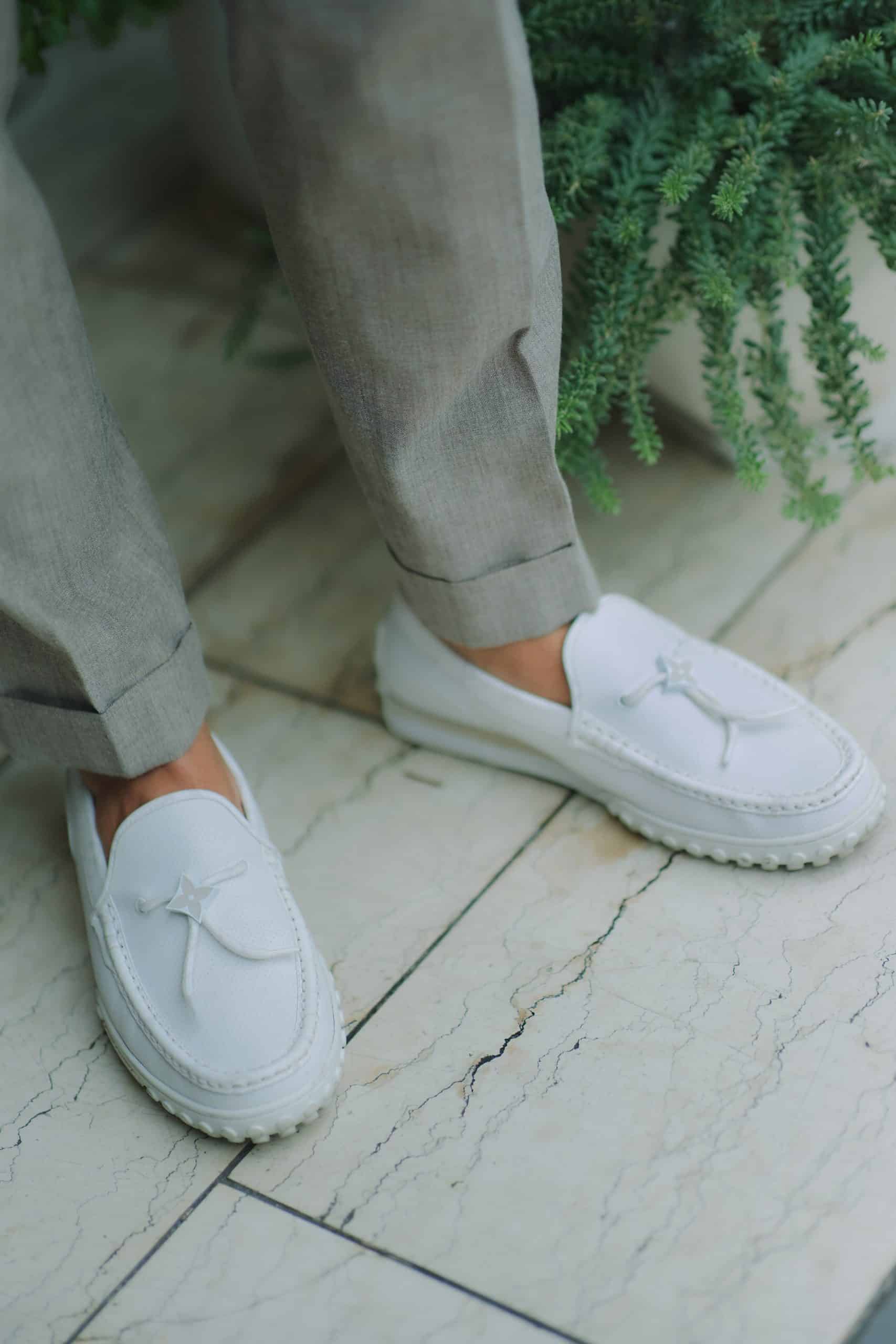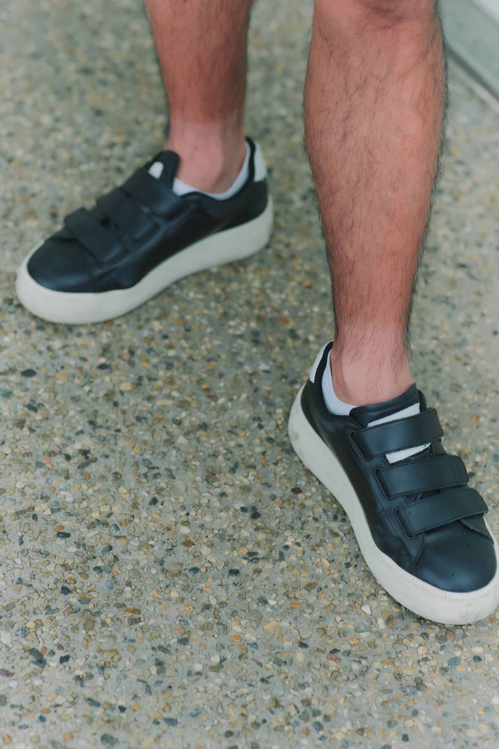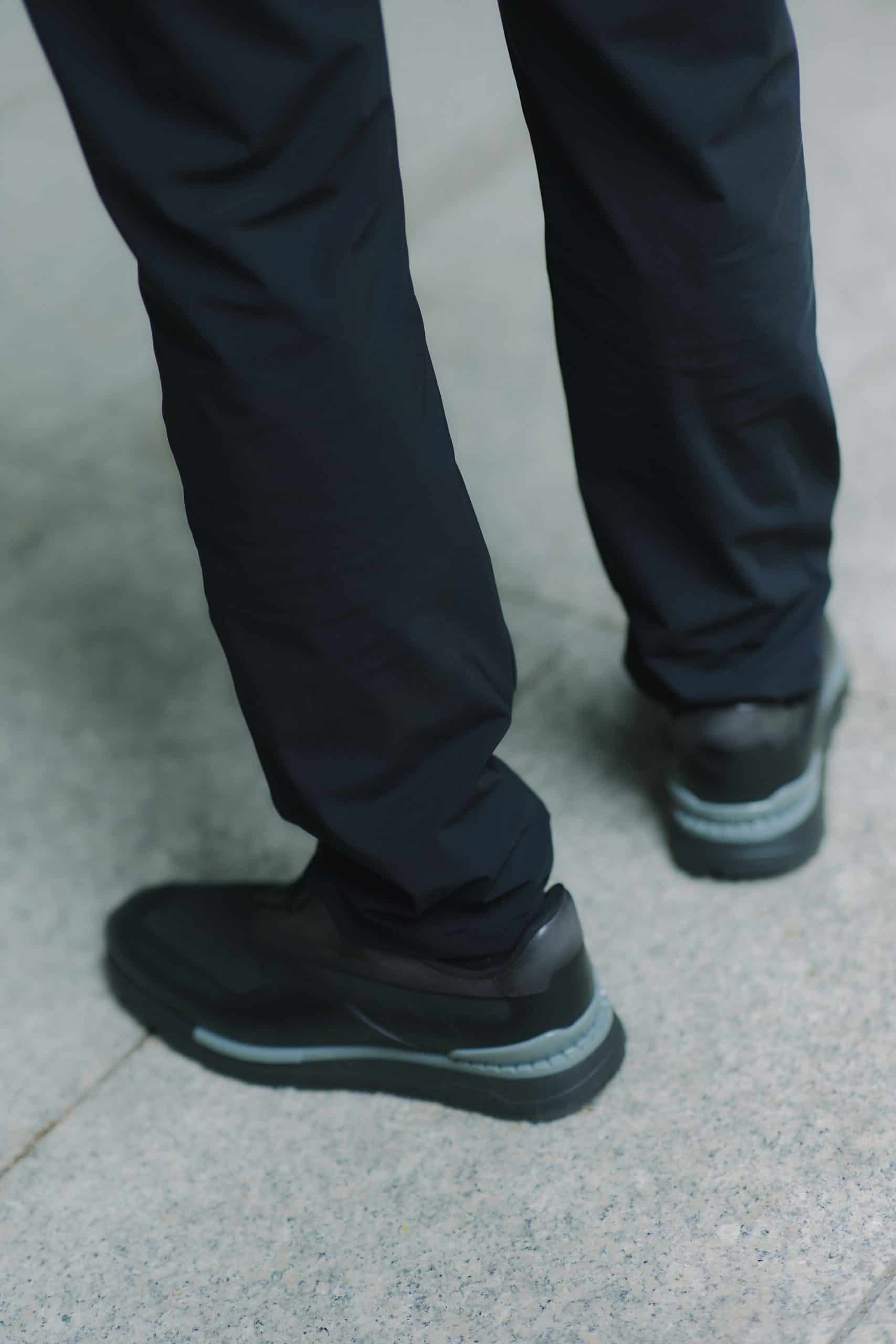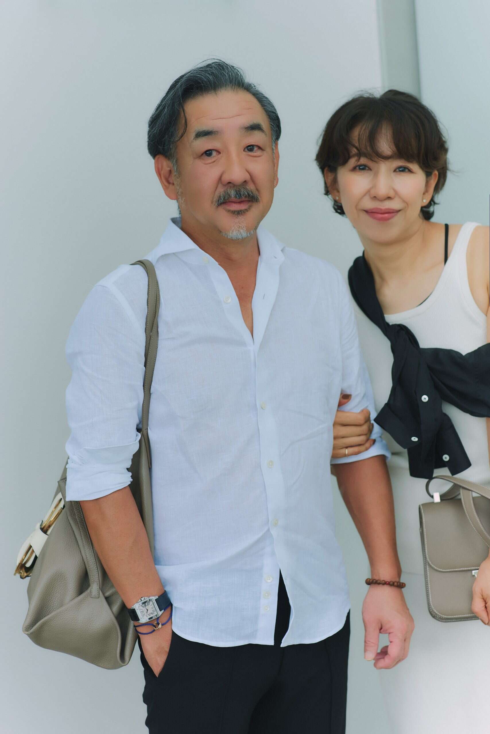 二人とも黒と白のモノトーン。裕子さんは小物までブラックに統一しつつ、カーディガンのみ純白に。そのカットレースとパールのボタンが品の良さをランクアップ。かたや、彰一さんはインナーと足元だけに白を配してコーディネートに精悍さがプラスされています。