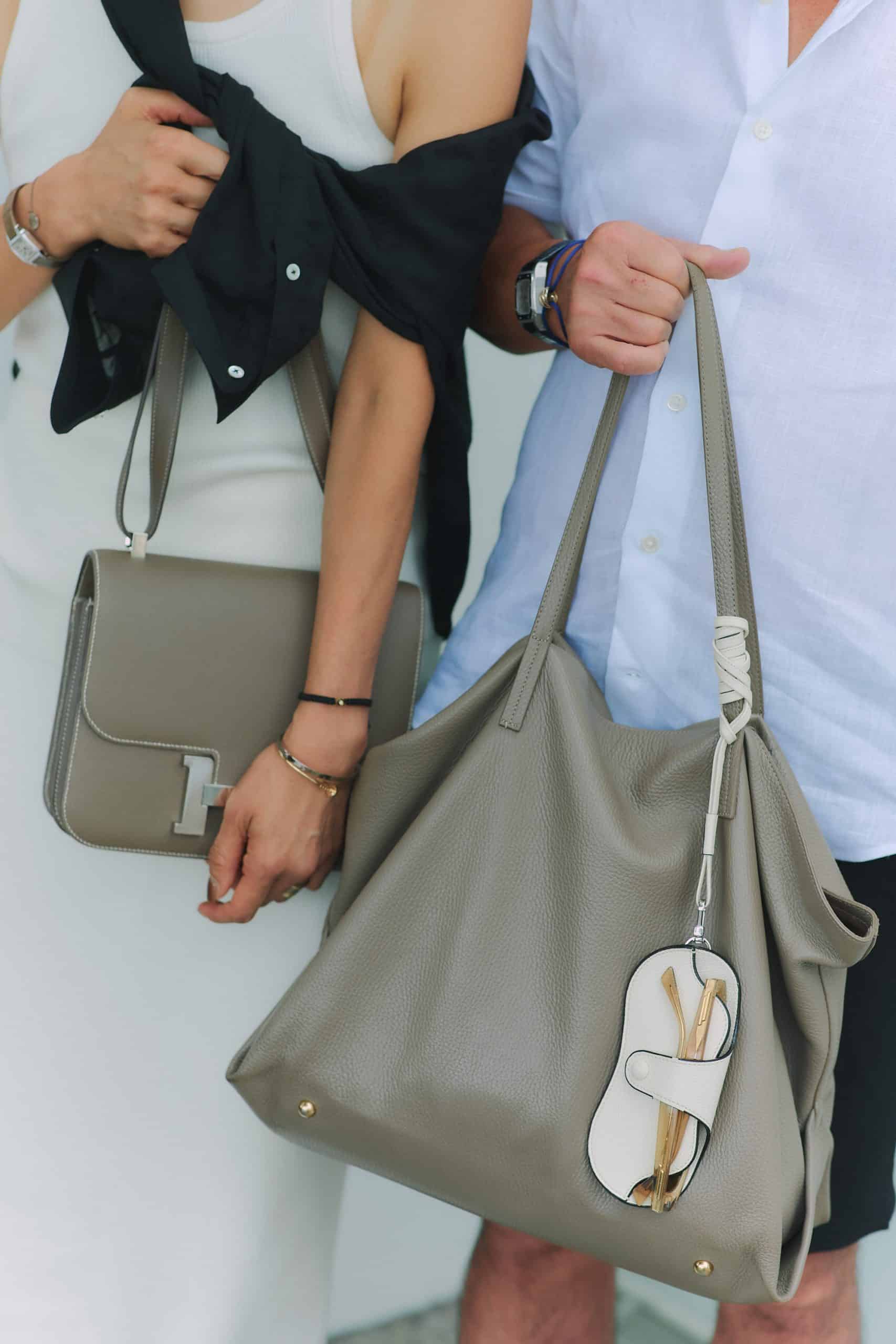 白を基調に、ポイントに黒を活かした大人のコーデ。理香さんの肌見せが、大人の余裕をまとったリュクスなスタイルを感じさせます。ポイントになる小物たち、バッグが程よく色合わせされており、まさに27年の時間の積み重ねがスタイルに。一緒に出かける時、玄関で思わず「えええ!!お揃いすぎる」と慌てて着替えることも多いそう。お互い好きな色が似ているがあまり、思いもよらずペアルックになってしまうとか。