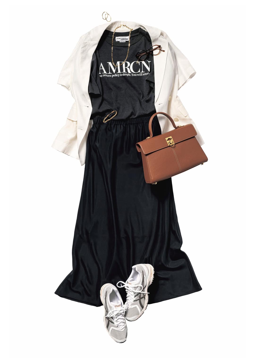 ジャケット¥23,100(マイストラーダ)Tシャツ¥13,200 (アメリカーナ×ジーンズ ファクトリー/ジーンズ ファクトリー 卸団地本店)スカー ト¥18,700(アンクレイヴ/ アンクレイヴ〈オンワード樫 山〉)バッグ¥107,100(カフネ /カフネ カスタマーサポー トセンター)シューズ¥ 15,400(アシックス/アシックスジャパン カスタマーサポート部)メガネ¥35,200(ブラン/ライト)ピアス¥ 132,000(ウノアエレ/ウノアエレ ジャパン)ネックレス¥ 20,900(ココシュニック オン キッチュ/ココシュニック)ブレスレット¥57,200(O-KI /ロードス)