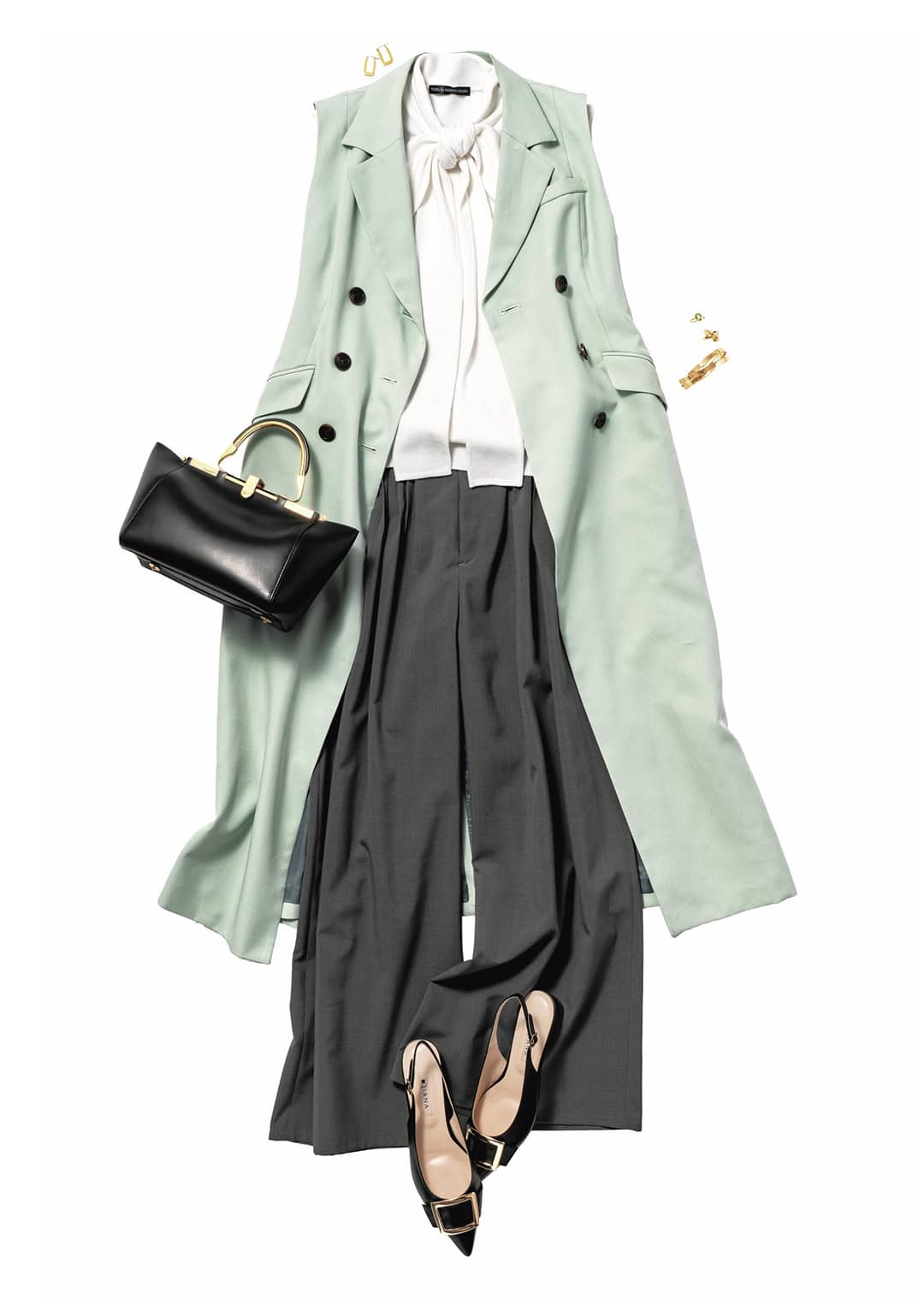 ロングジレやボウタイブラウスなど、都会的な華やぎアイテムで魅力を倍増させて。
