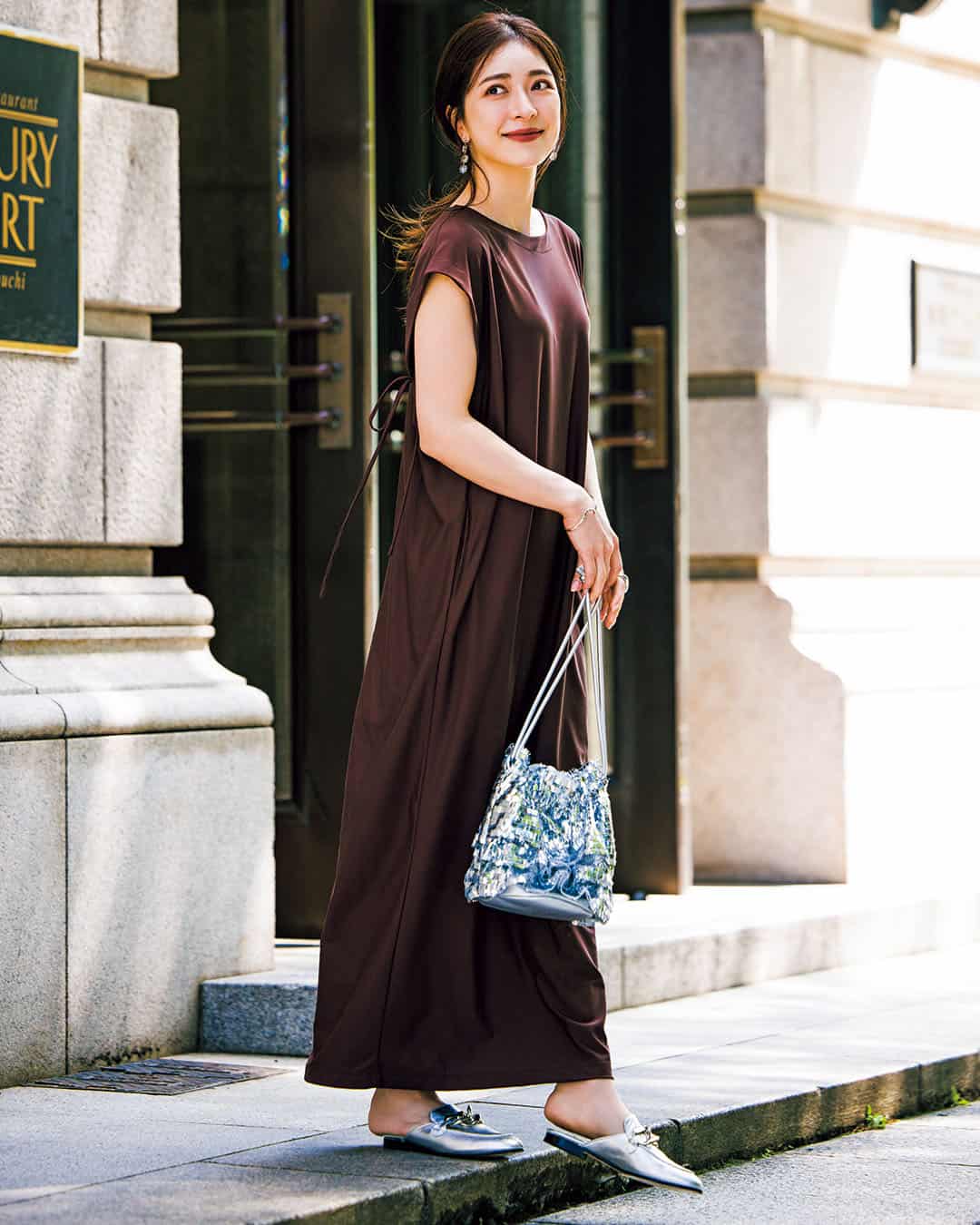 ワンピース¥8,990(ミーリー)バッグ¥6,930( ル タロン/ル タロン 有楽町マルイ店)シューズ¥42,900(カステラーノ/フラッパーズ)イヤリング¥2,860〈ハクフルール〉リング¥3,520〈ヘンカ〉(ともにロードス)ブレスレット¥23,100(ニナ・エ・ジュール/ショールーム ロイト)